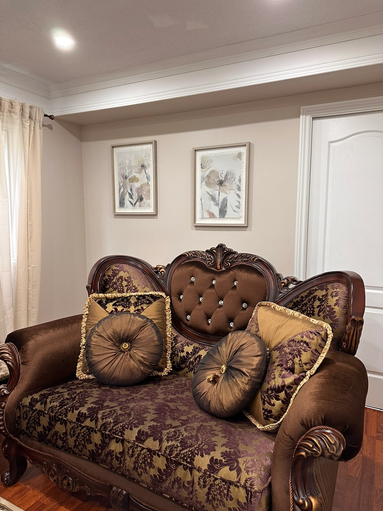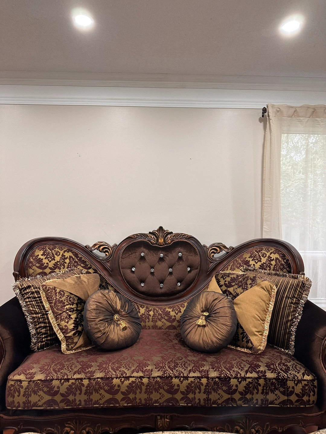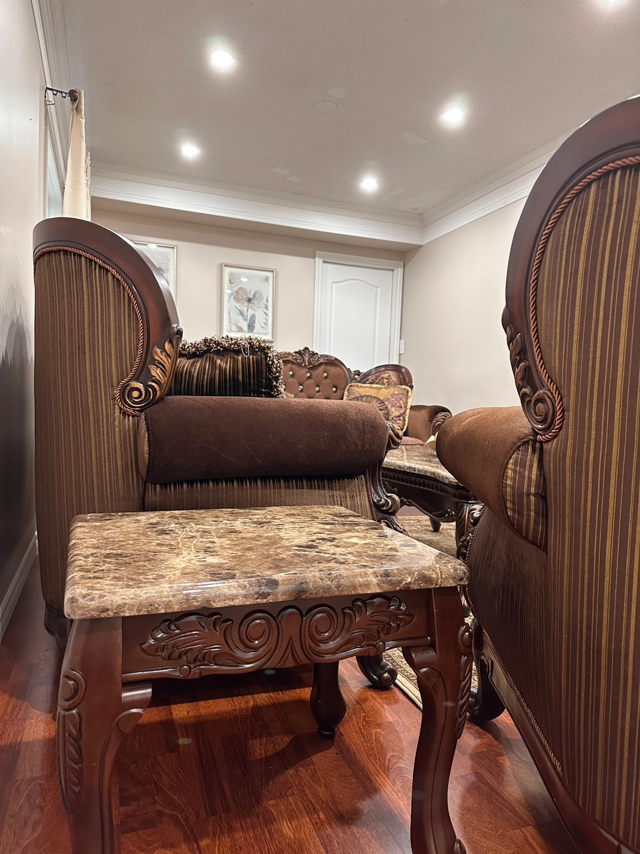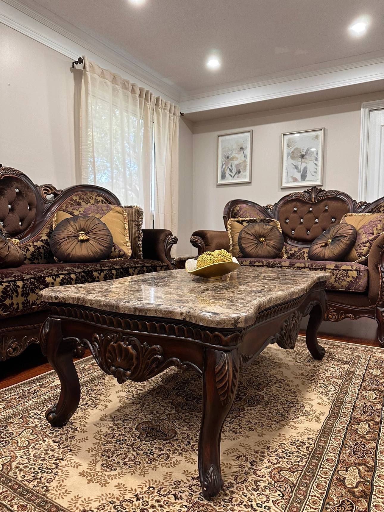 10Elegant Brown Royal Couch Set for Sale Transform your living space with this stunning three-piece couch set, featuring a luxurious love seat, a single seat, and a spacious three-seater couch. Each piece is adorned with beautifully placed gems on the pillows, adding a touch of elegance to your home. Purchased in 2020, this set has been barely used and is in great condition. Alongside the couch, you'll receive a beautiful real marble coffee table, complemented by two side tables, all in excellent condition. Included is a stylish carpet measuring 5 feet by 8 feet, perfect for enhancing the overall look of your space. Please note that the sets will not be sold separately. Serious inquiries only. Don’t miss this opportunity to elevate your home at half the cost! The cost if for everything included.