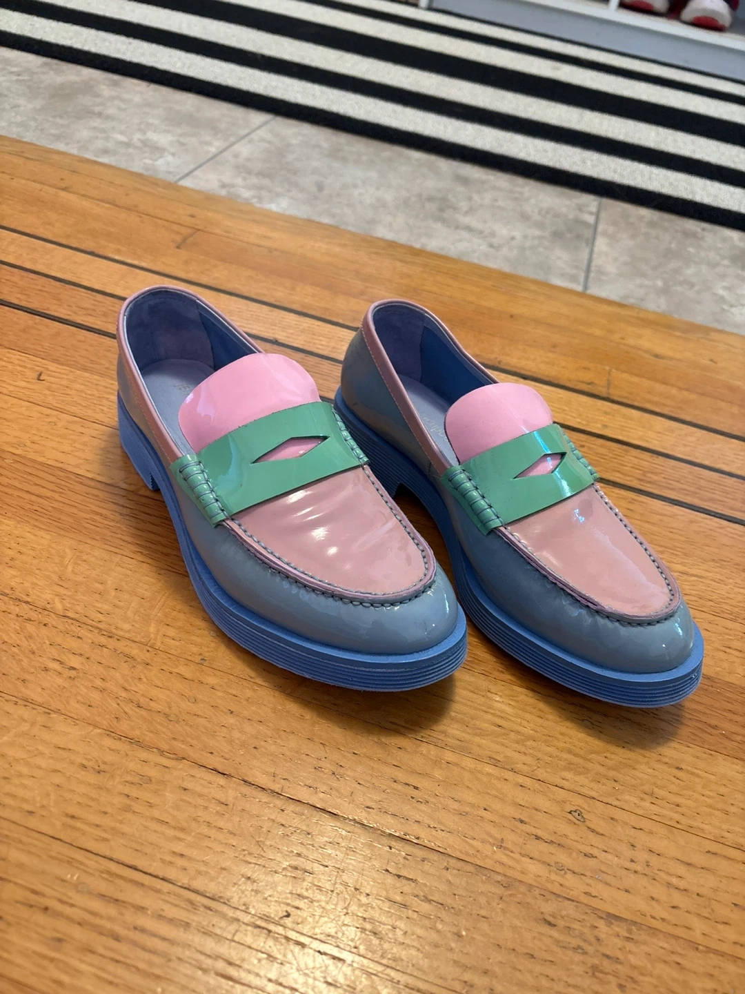Stylish loafers in a unique colour combination! These shoes feature a light blue base with a pink upper and a green accent strap. Perfect for adding a pop of colour to any outfit!