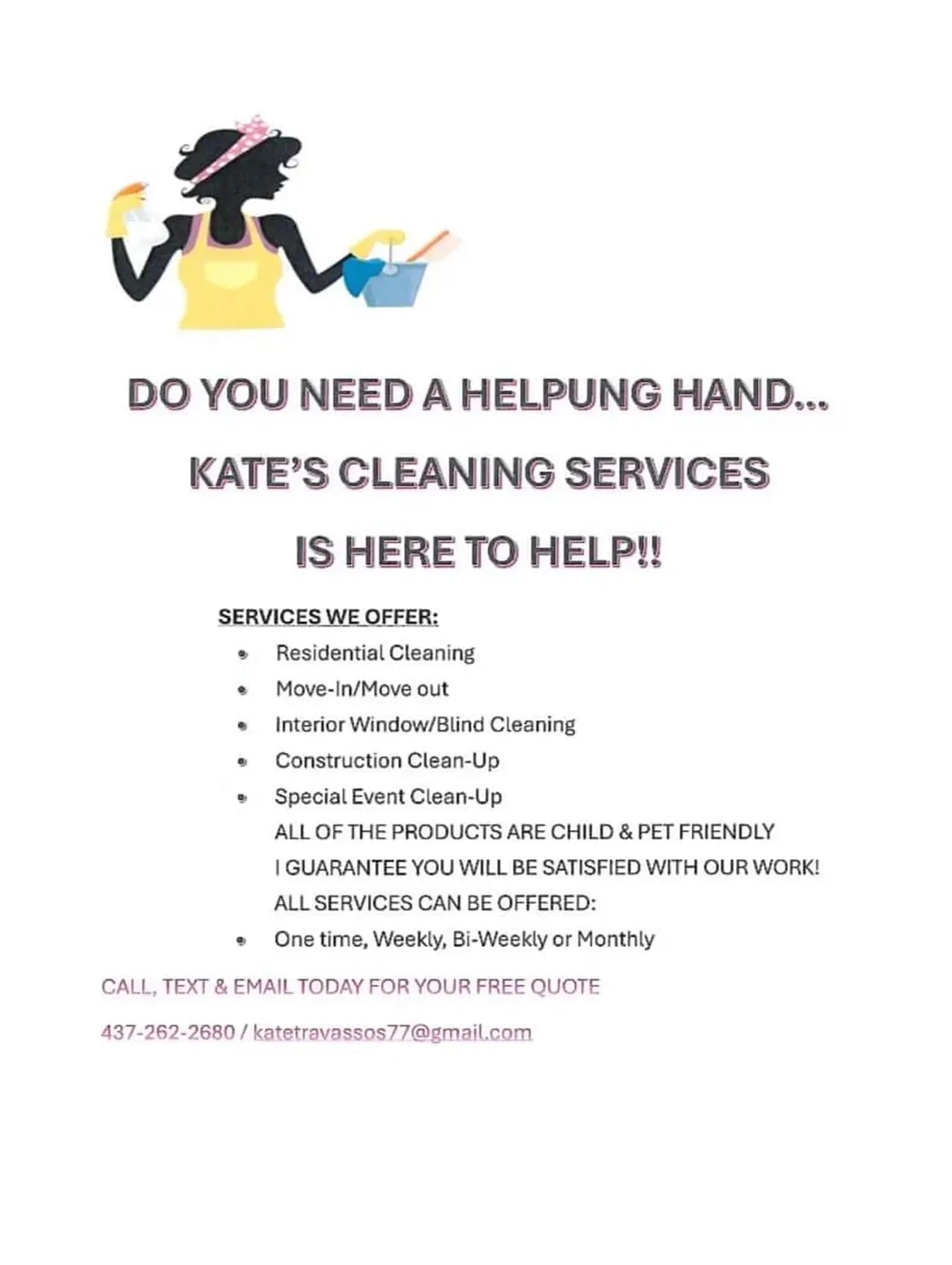 70Hello I’m you’re local cleaning lady my name is Kate and I’d love to come make your house sparkle. I have been cleaning houses for over a decade. If your interested message me and we can customize a cleaning routine that works for you!