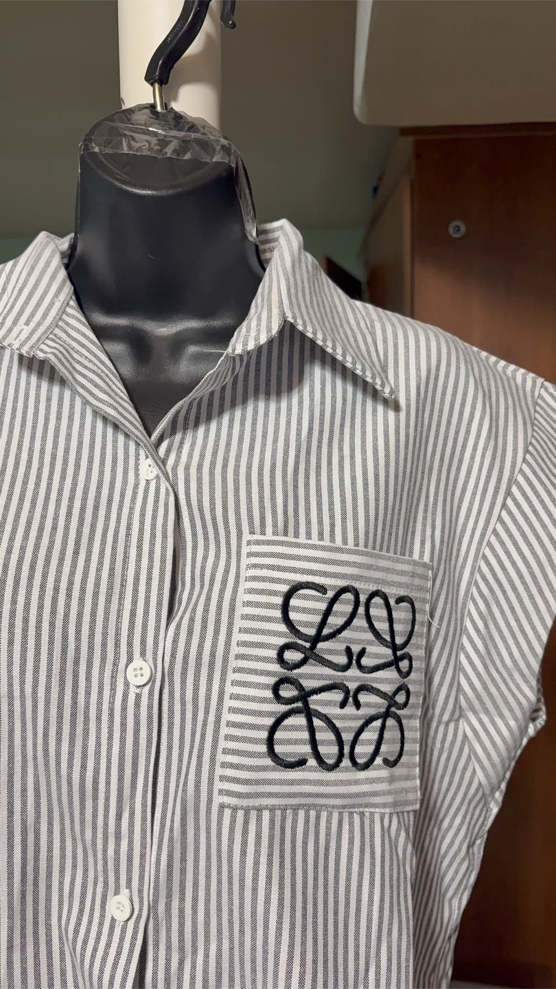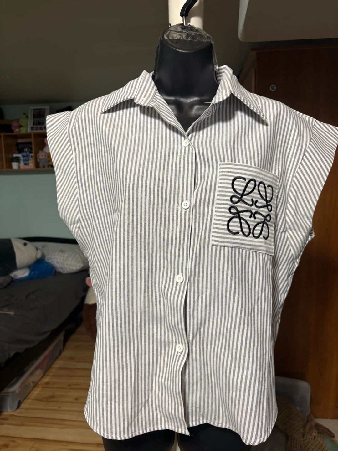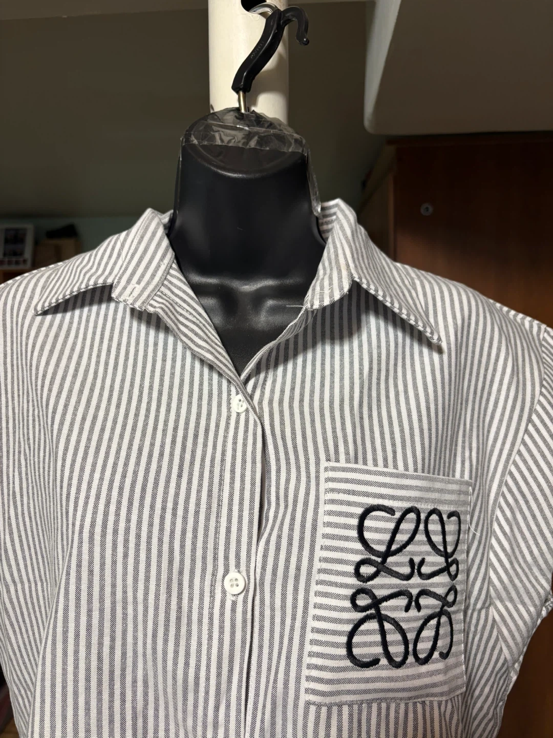 Here's a stylish Loewe sleeveless shirt with a classic striped pattern! It features the iconic Loewe logo embroidered on the pocket, adding a touch of luxury to your wardrobe. It's in great condition and ready for a new home new, no inclusions - comes from pet friendly & smoke free house