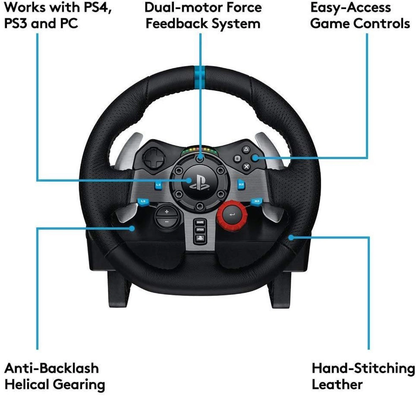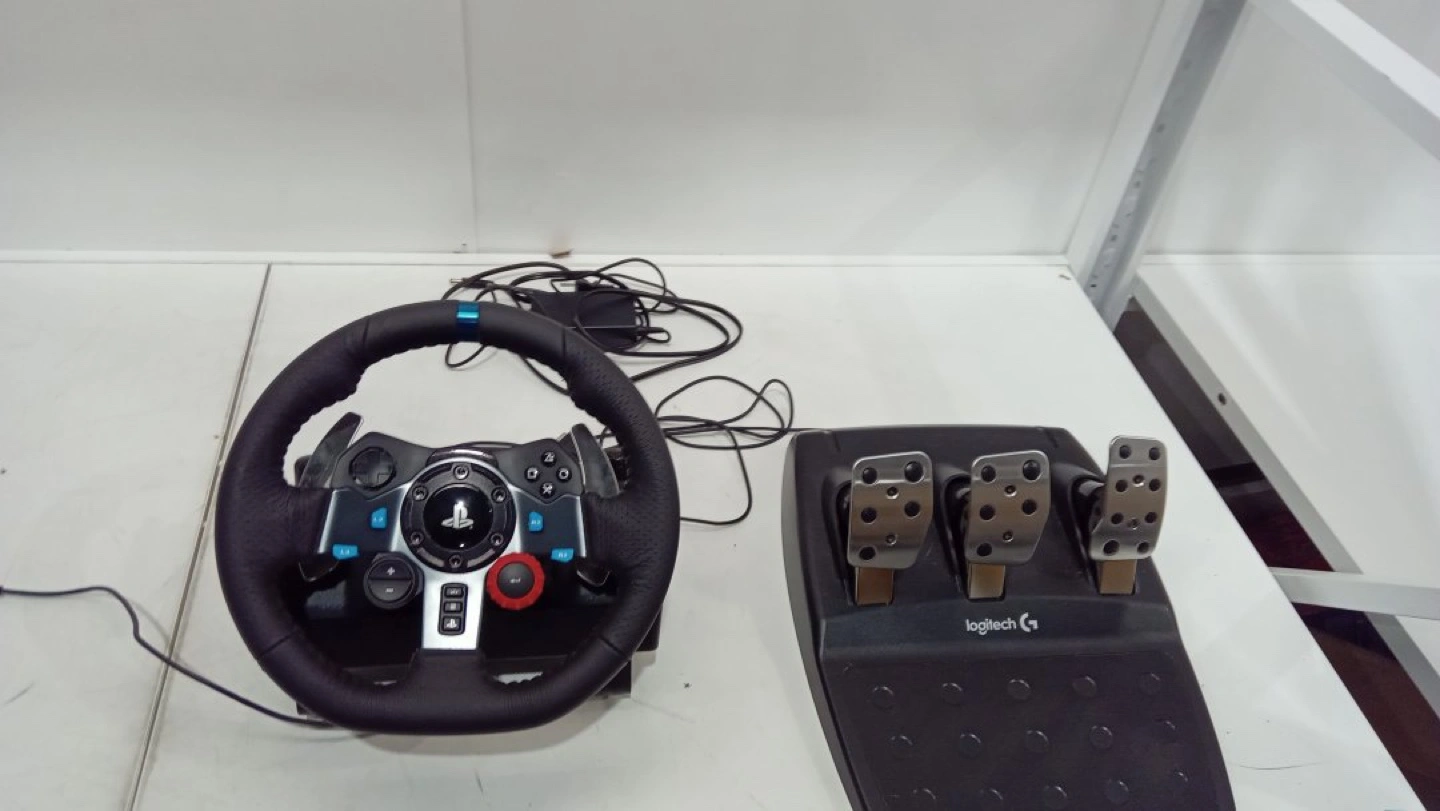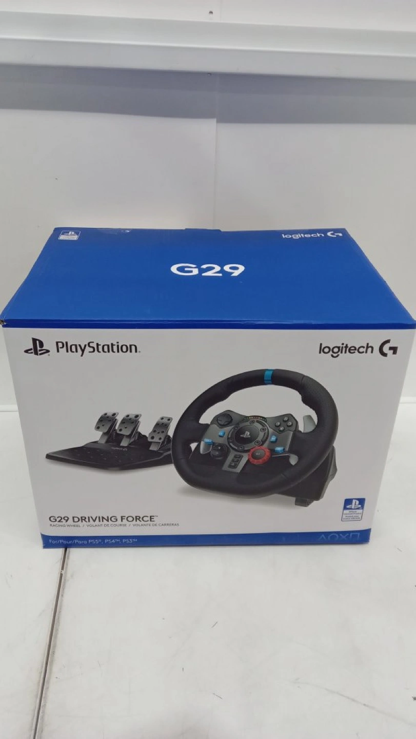 Used Logitech G29 Driving Force racing wheel and pedals. Compatible with PS5 ,PS4, PS3, and PC. Features dual-motor force feedback, hand-stitched leather wheel, and helical gearing. Includes all components shown in the image.