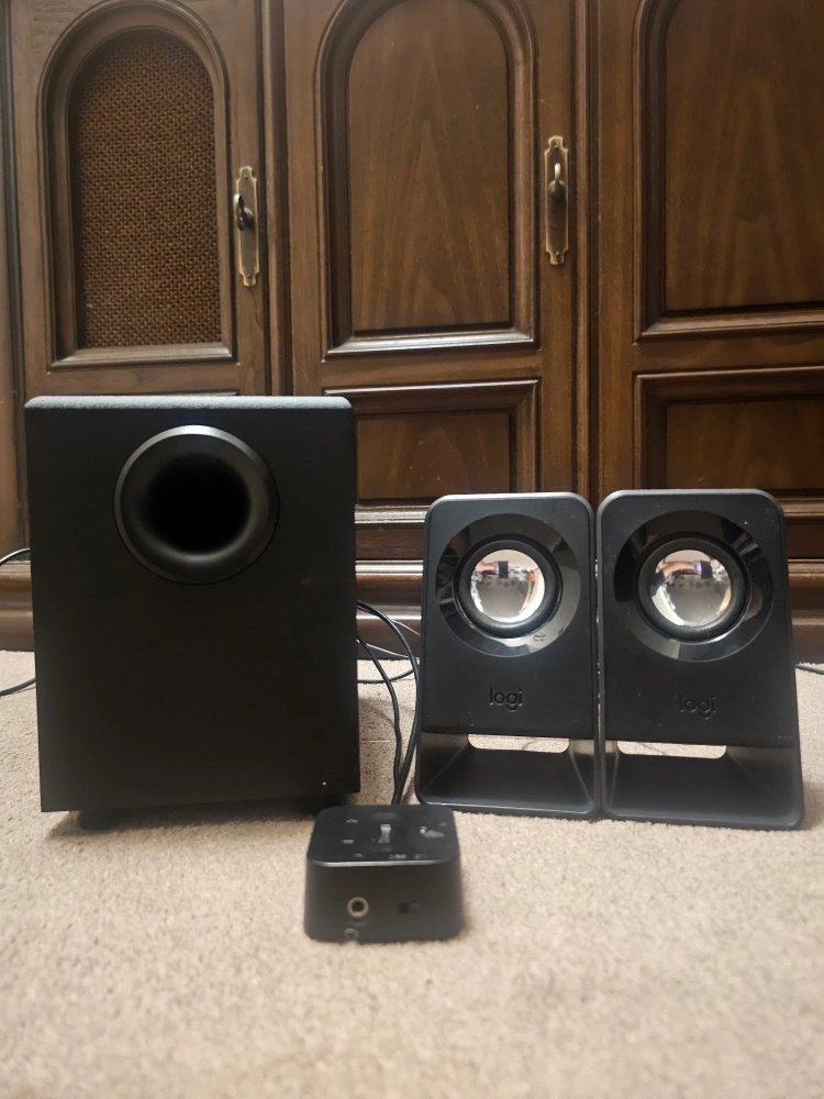 Selling a Logitech Z313 speaker system. This set includes a subwoofer, two satellite speakers, and a control pod. Perfect for your computer or home entertainment setup!