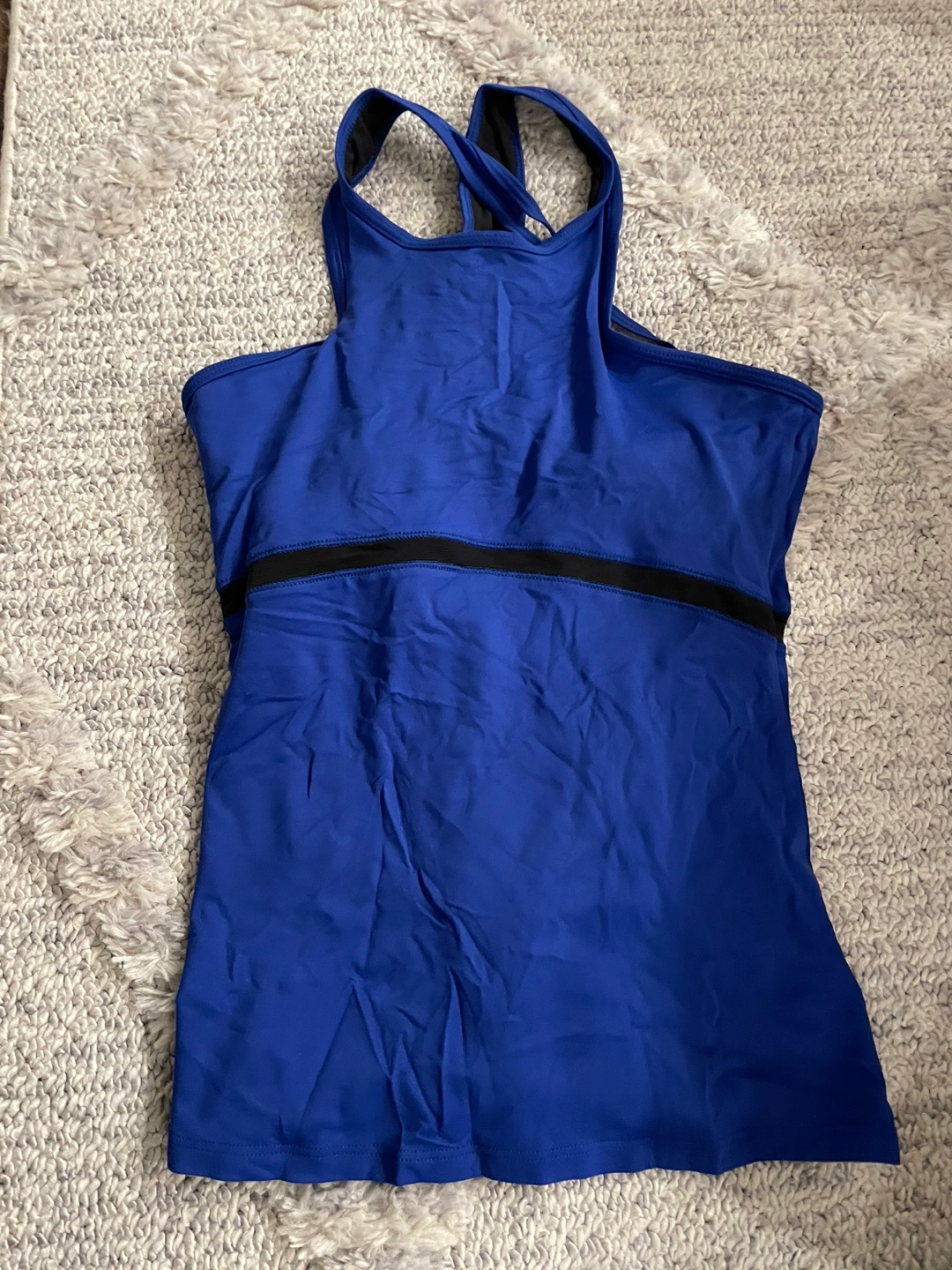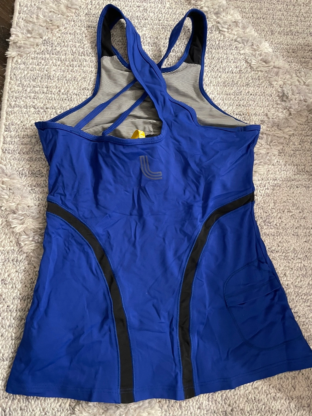 63Blue tank top with black accents and a criss-cross back and small back pocket. Like new. Size extra- small.