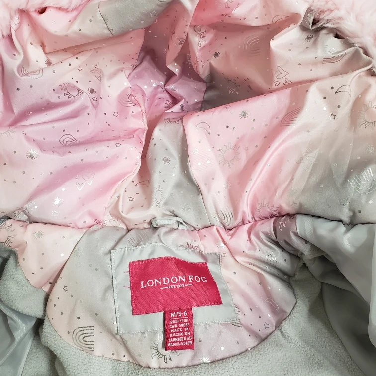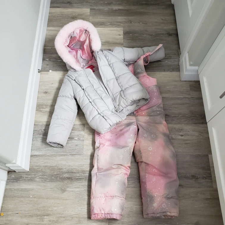 In excellent condition. Girls' snowsuit, size 5/6. Grey puffer jacket, pink galaxy print snow pants. Faux fur-trimmed hood. Bought new from the Bay and worn only for a couple of months then grew out. Sfpf home pick up in the rapids