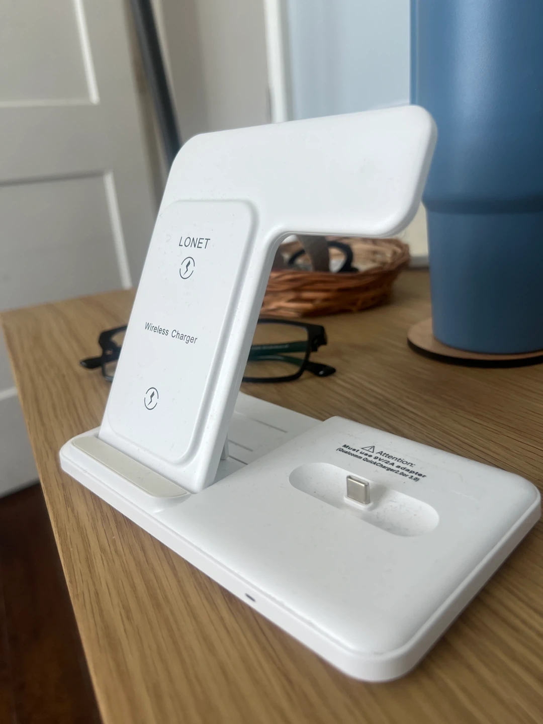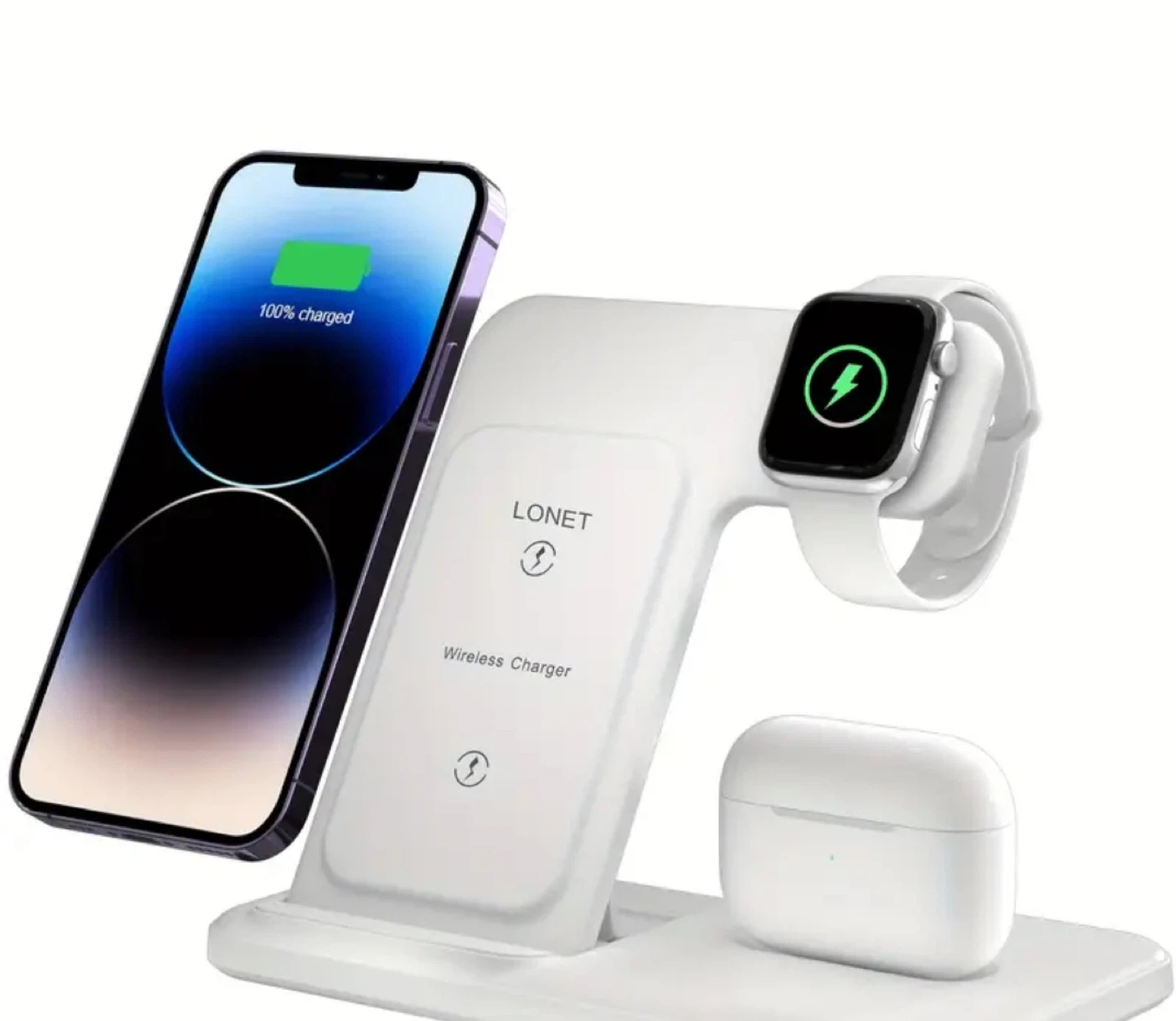 10This is a LONET wireless charger stand in white. It can charge your phone, Apple Watch, and AirPods at the same time. It's in great condition and works perfectly! 3-in-1 Wireless Charging Station, Charging Dock Station for Airpods with Type-C port and Earbuds, Folding Wireless Charger Stand for iPhone Multiple Devices 16/15/14/13/12/11/Pro/Max/Mini/8/Plus/X/XR/XS/X/SE, for iWatch Series 10/Ultra/9/8/7/6/5/4/3