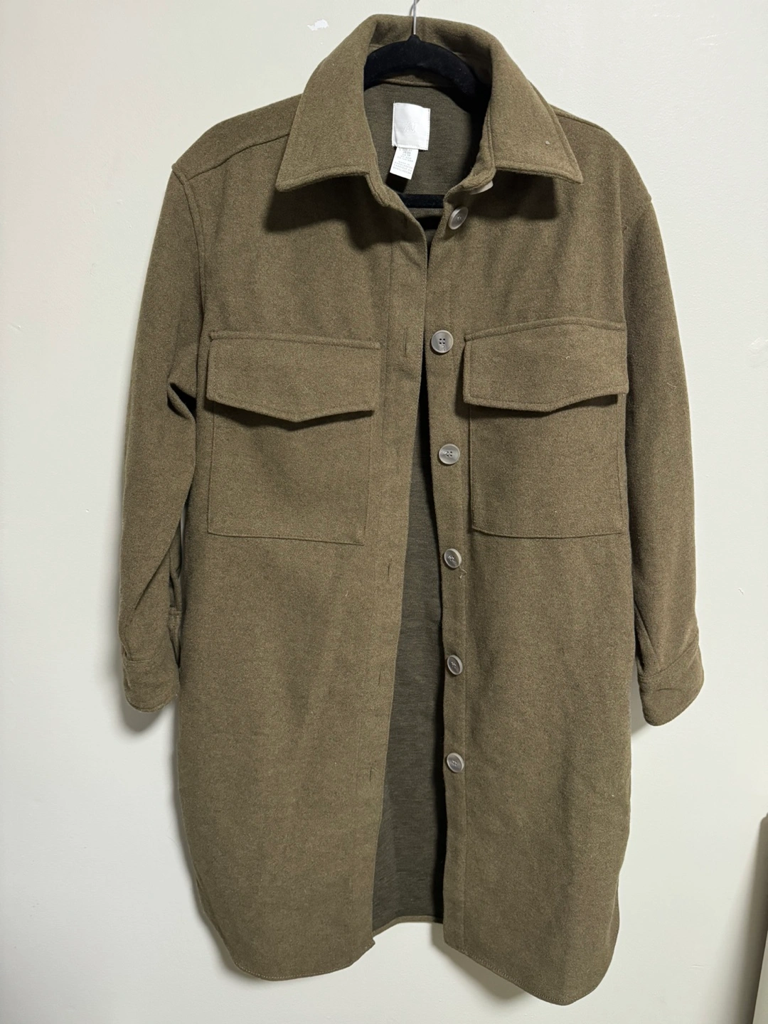 Show all- I’m 5’5” and the jacket is just below the knee - olive green colour - size XS - oversized fit