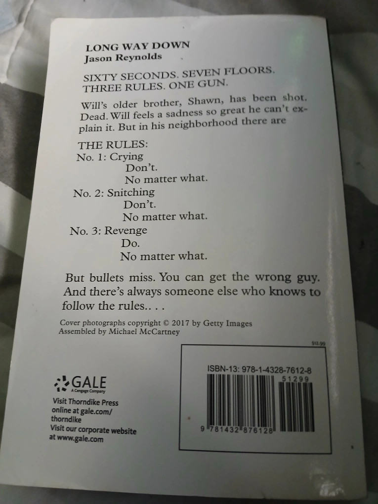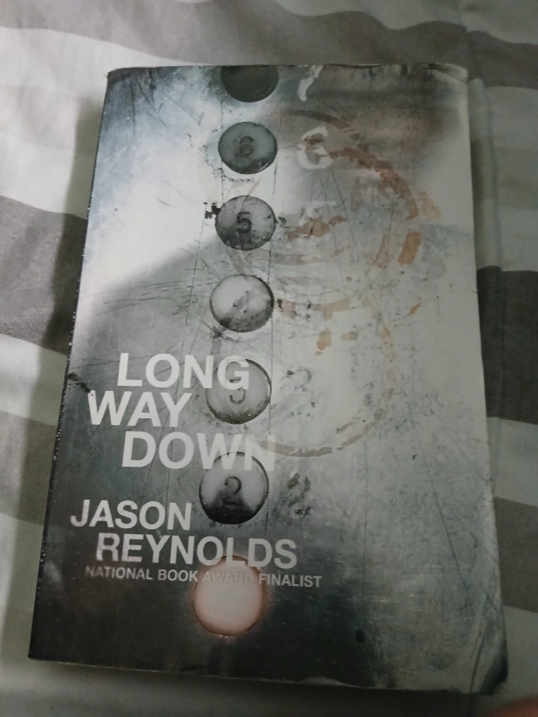 15Selling the book 'Long Way Down' by Jason Reynolds! It's a national book award finalist. The book is about sixty seconds, seven floors, and three rules. A compelling read!