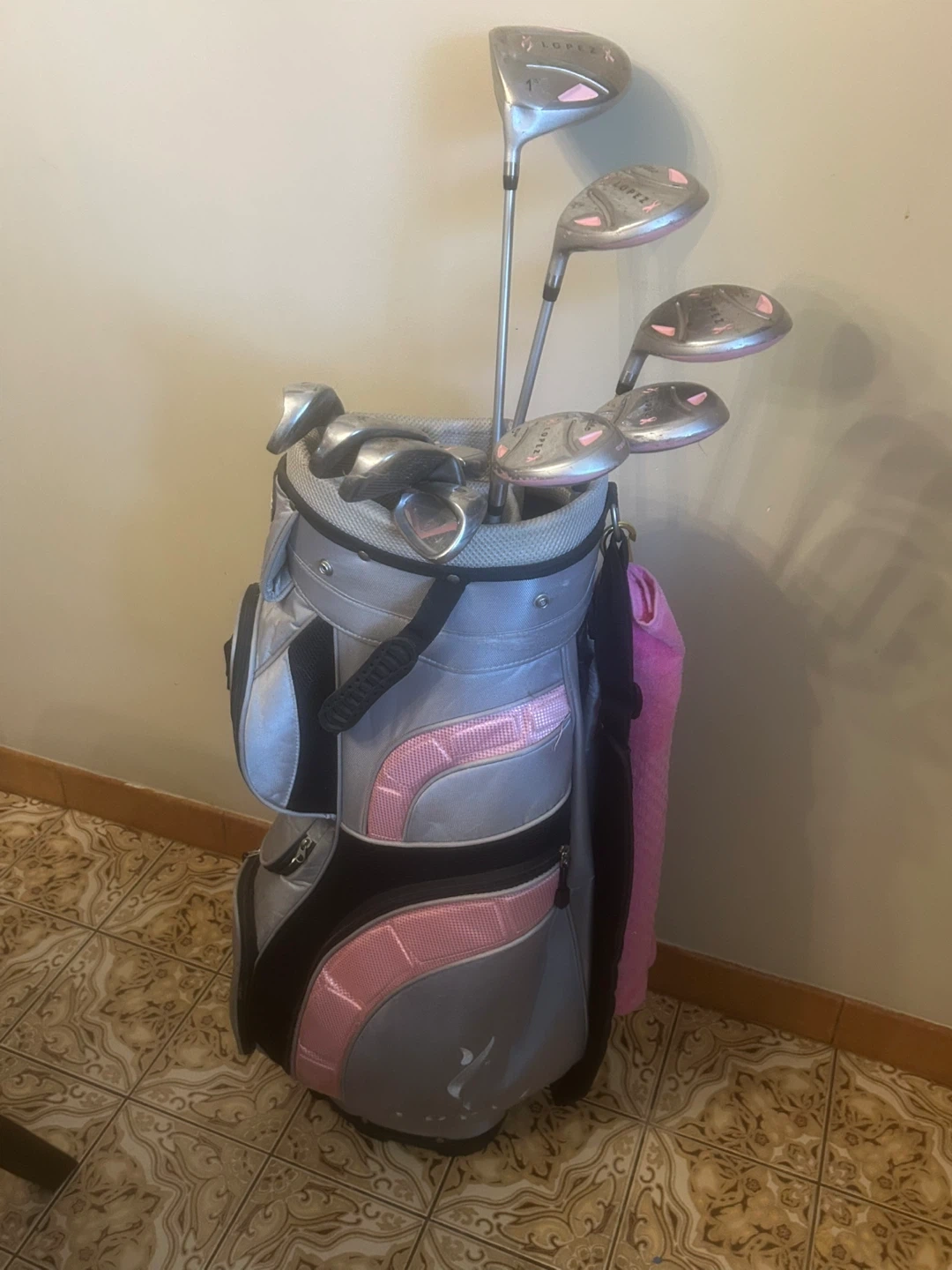 10Selling a set of Lopez Elite golf clubs, perfect for hitting the links! The set comes with a matching golf bag in silver and pink. Great for beginners or intermediate players looking for a stylish and functional set