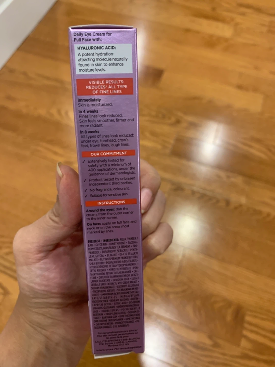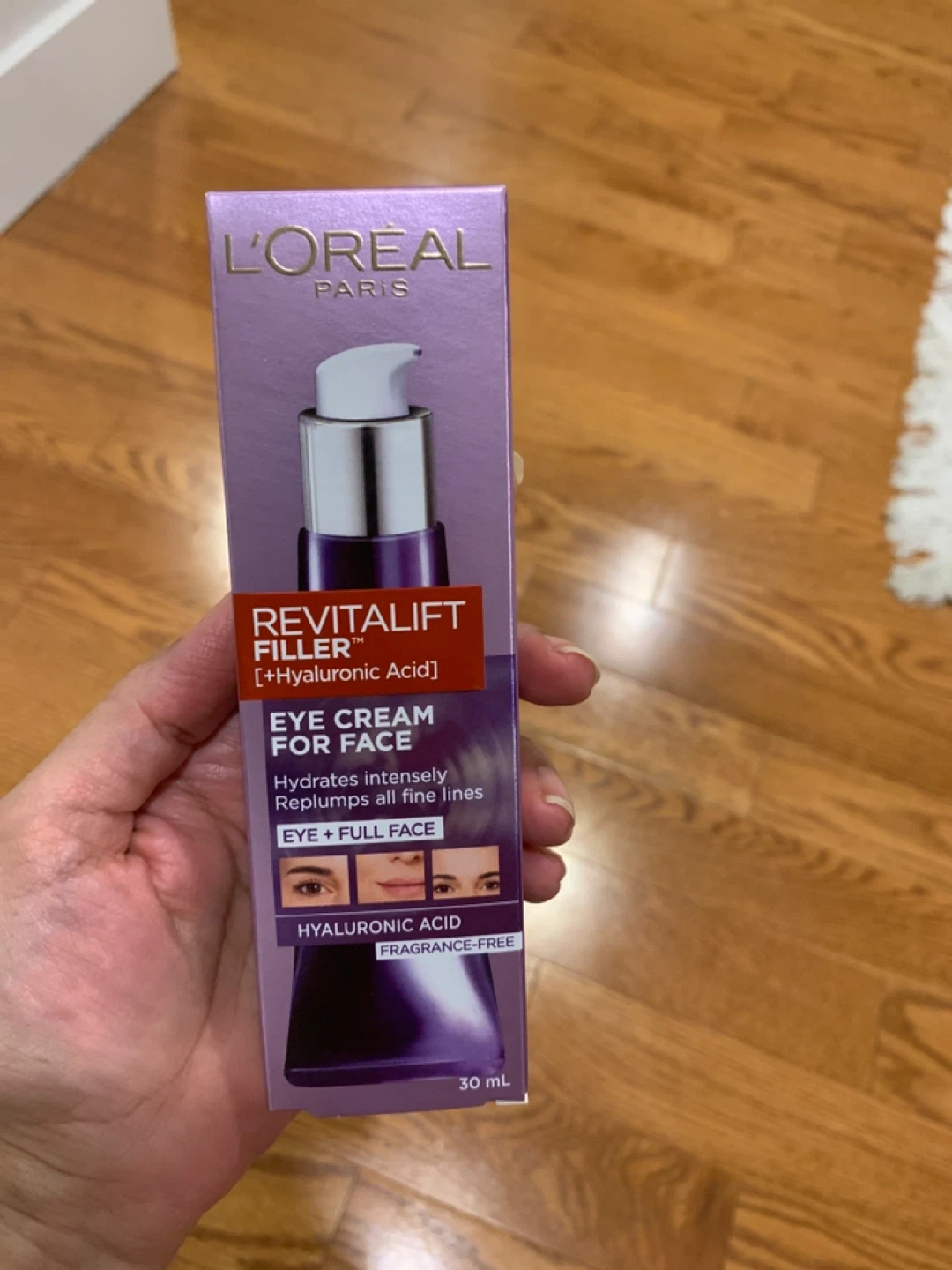 20I'm selling a L'Oreal Revitalift Filler [+Hyaluronic Acid] Eye Cream for Face. It comes in a 30ml size. Regular price is 47.99 .This daily eye cream is designed for full face use and contains hyaluronic acid to enhance moisture levels. It helps reduce the appearance of fine lines and is suitable for sensitive skin