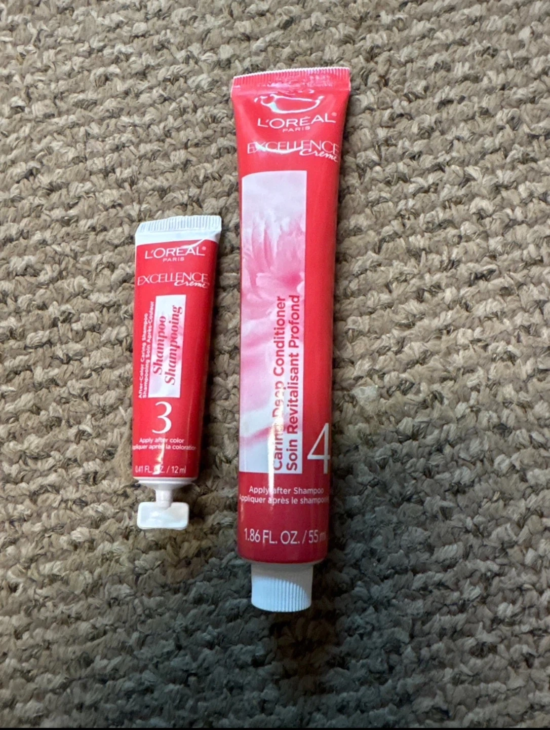 Selling a set of L'Oreal Excellence hair care products! This includes the Caring Shampoo (0.41 fl oz/12ml) and the Caring Deep Conditioner (1.86 fl oz/55ml). Perfect for after-colour treatment to keep your hair looking its best