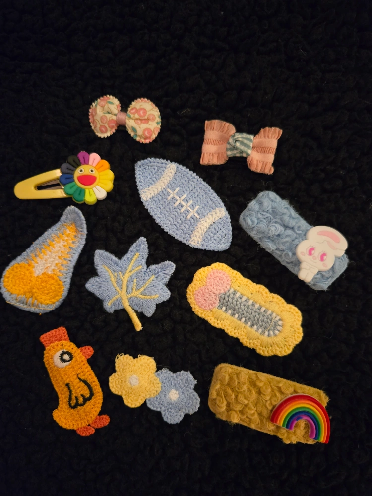 Assorted colourful hair clips. Variety of styles and designs. Crochet and fabric bows, flowers, and novelty shapes. Perfect for little girls. Pick up at Metrotown Cash Only