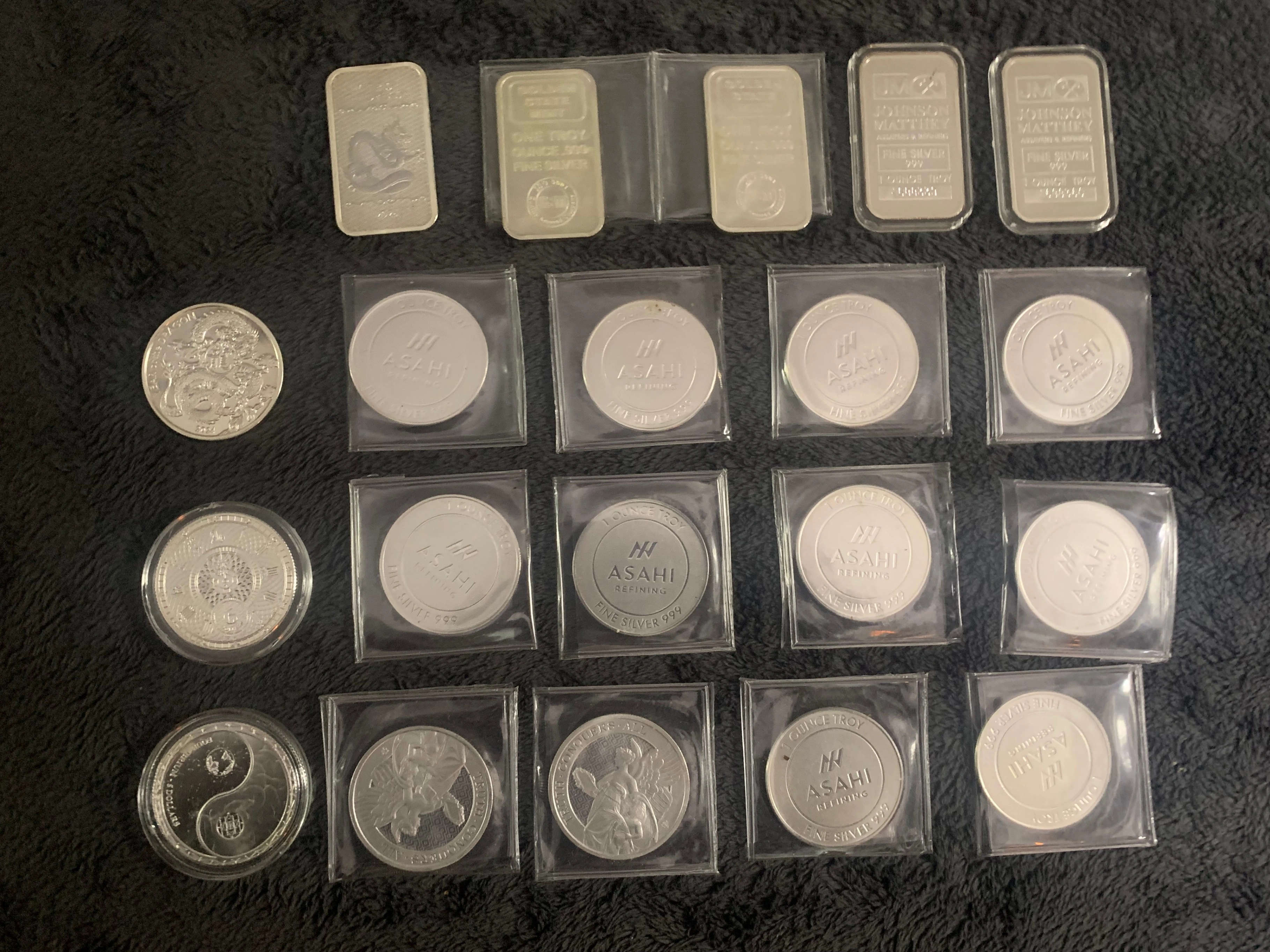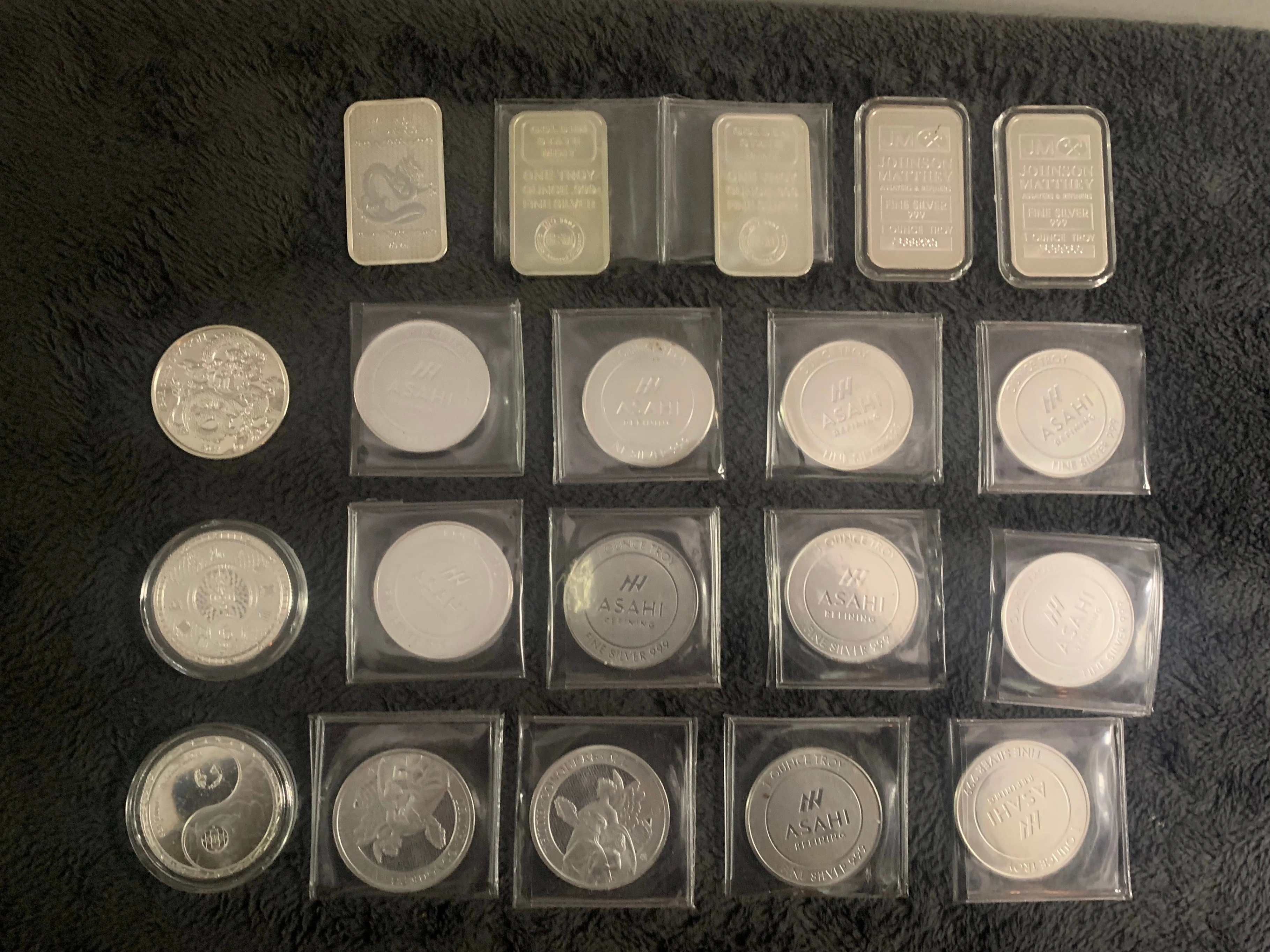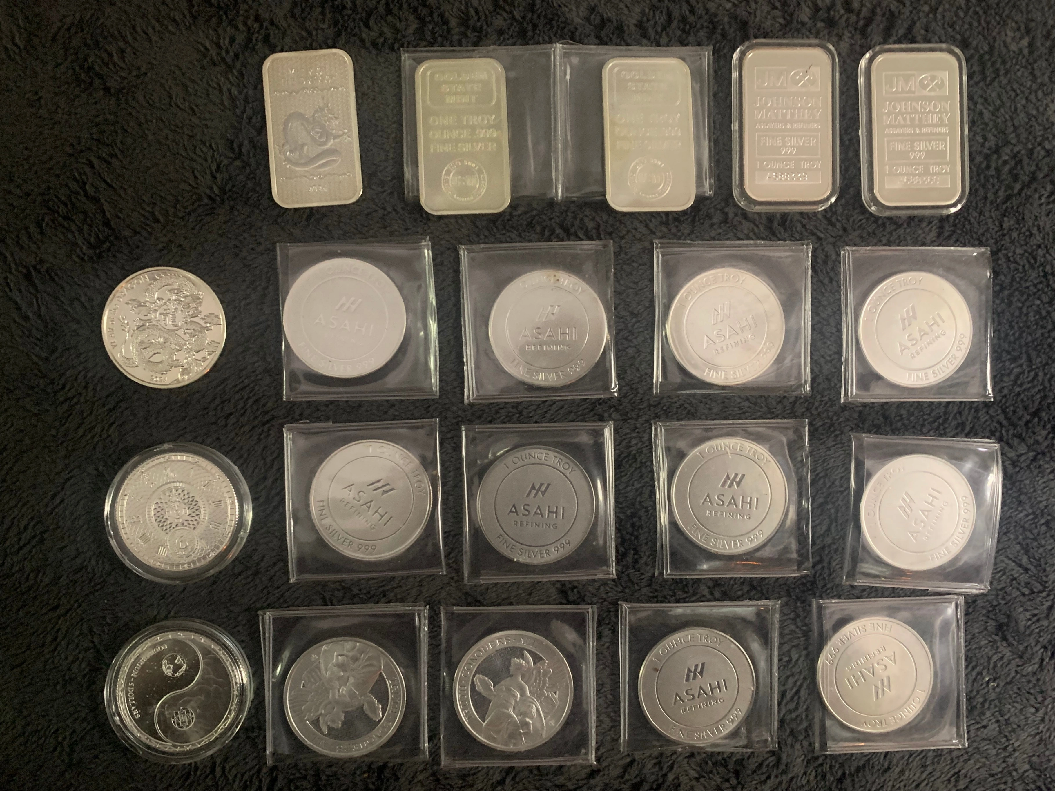 15Hello and good day, I have a Lot of 20, 1oz Coins / Silver Bars. There are no blemishes, safe stored. *Each is 1 Troy ounce of .999 fine silver, some sealed in a case, some in plastic sheathe, 2 are uncased *Silver bullion *$1,500 for the Lot of various 1 oz coins / silver bars. Delivery will be extra, I am firm on price. *I am not looking for any trades currently *please inquire if you have questions and or want further details Note: *what you see in the pictures is what you get