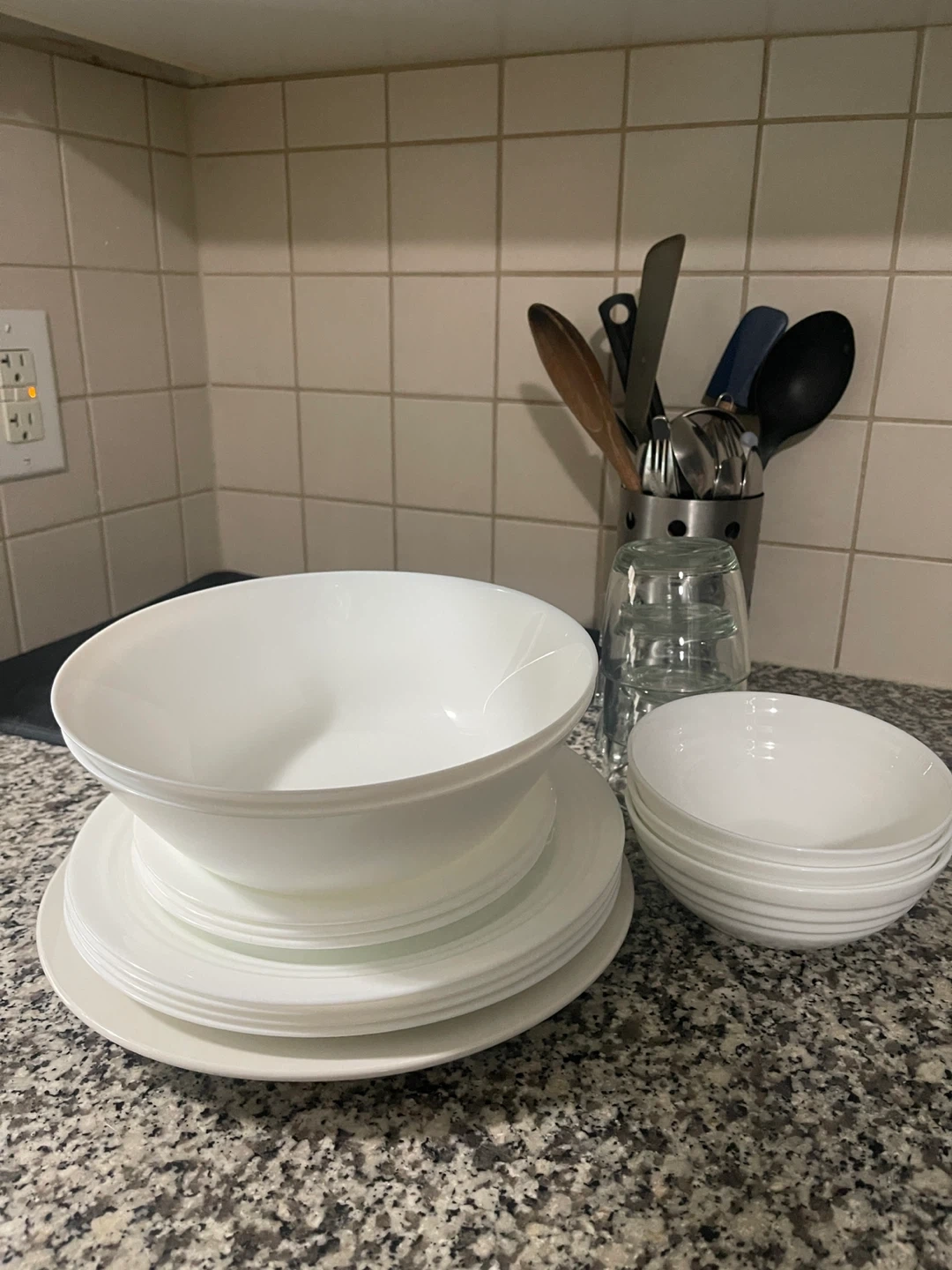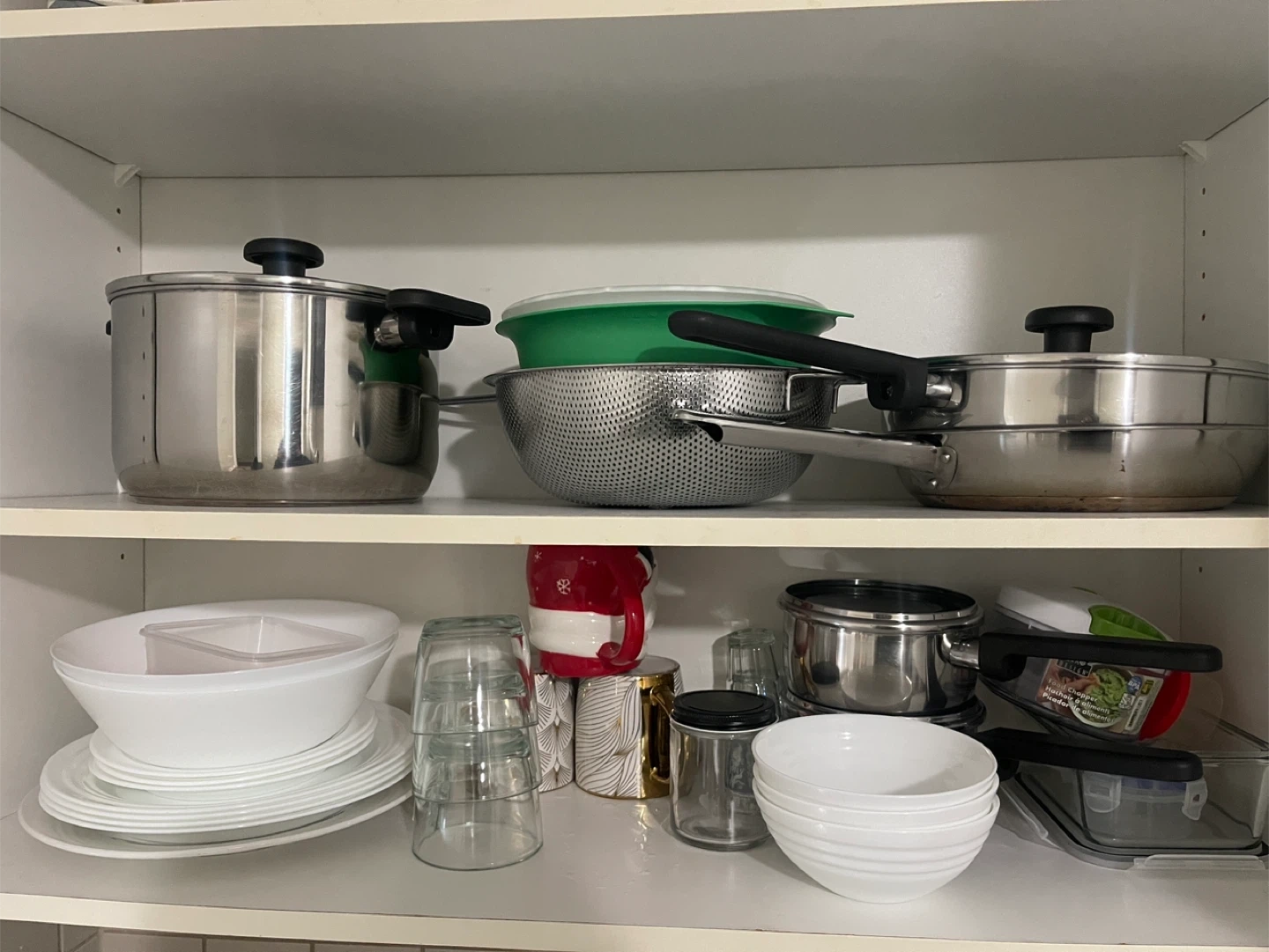 Selling a collection of kitchenware including bowls, plates, glasses, pots, and pans. All items are in good condition and ready for a new home!