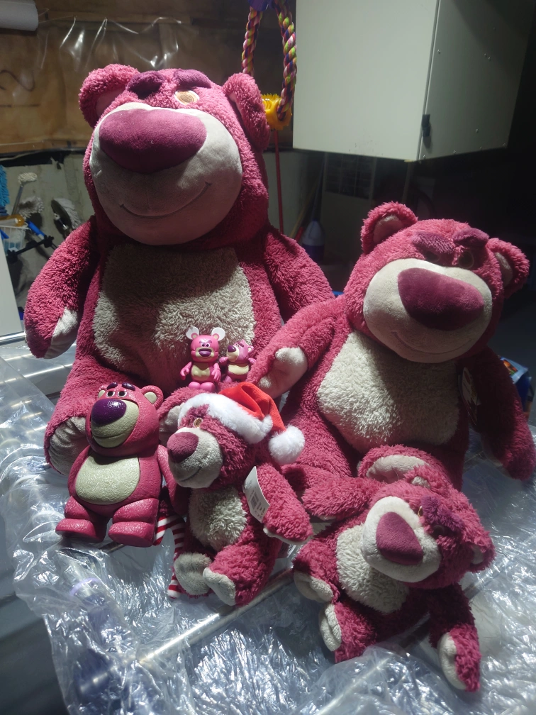 44Collection of Lotso plush toys. Various sizes. Strawberry scented. From Disney Store. One wears a Santa hat. Gand total value CAD200+, all plush with tag still on it.