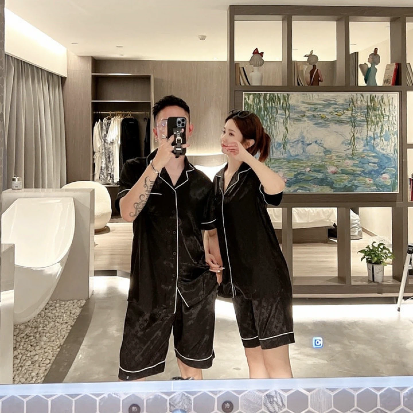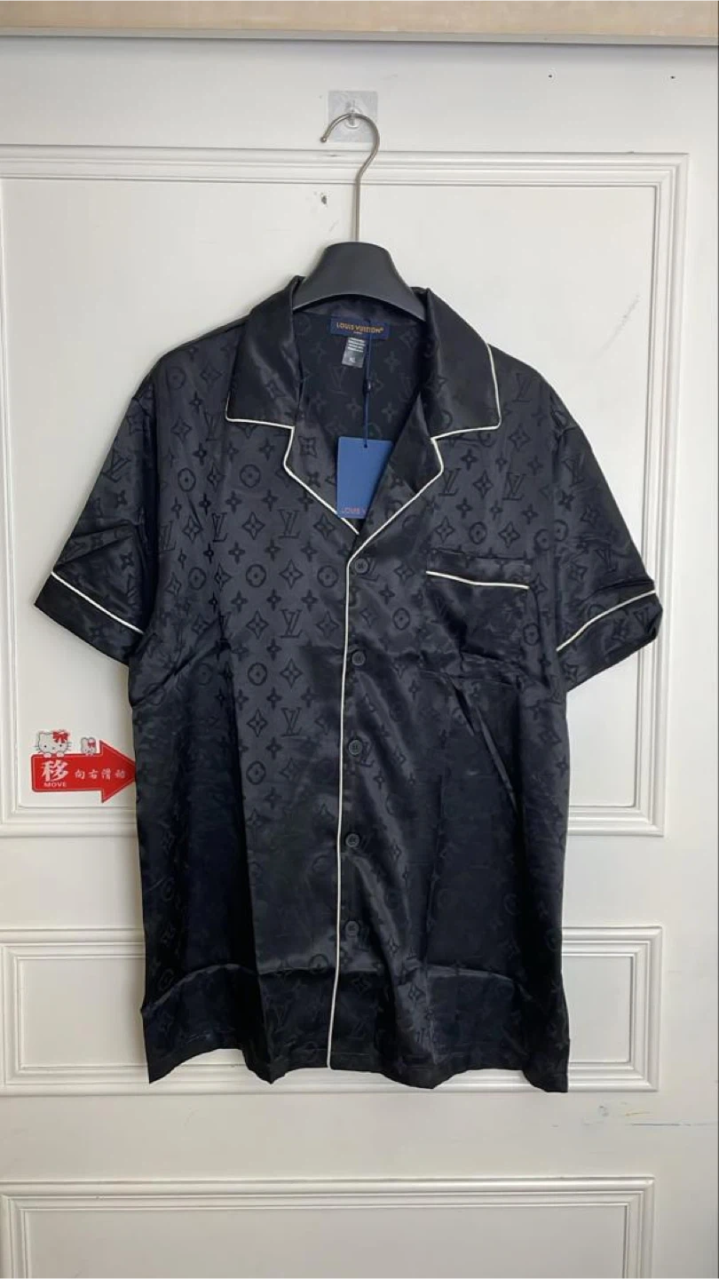 18This is a stylish black pajama set with a subtle Louis Vuitton pattern throughout. The set includes a short-sleeved top and shorts, both trimmed with white piping. It's perfect for lounging around the house in comfort and style!