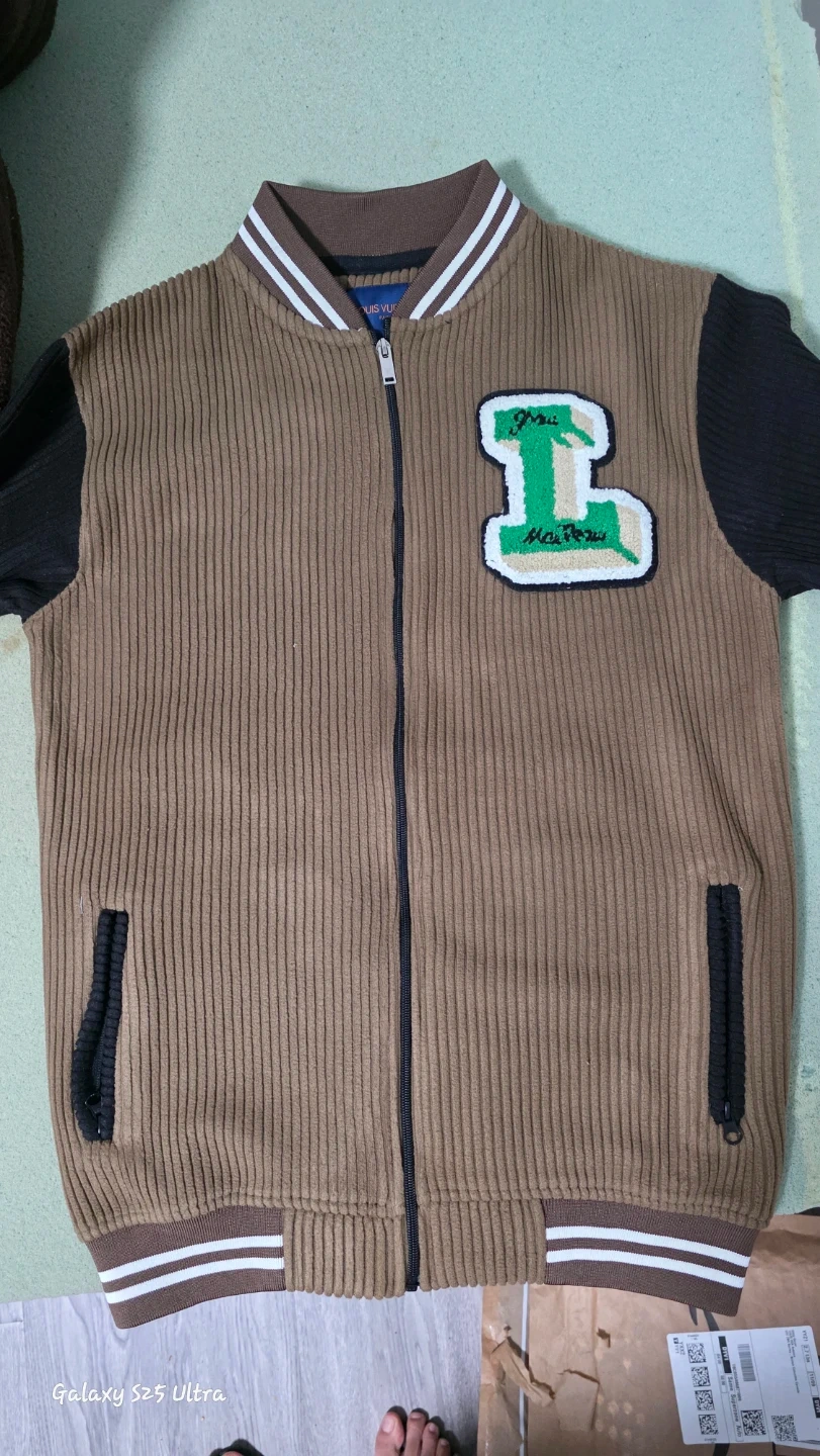 16Selling a Louis Vuitton varsity jacket featuring Bugs Bunny on the back. This jacket is a unique piece with a brown corduroy body and black sleeves. It has the LV logo prominently displayed, and a green 'L' patch on the front. Perfect for adding a touch of luxury and fun to your wardrobe!