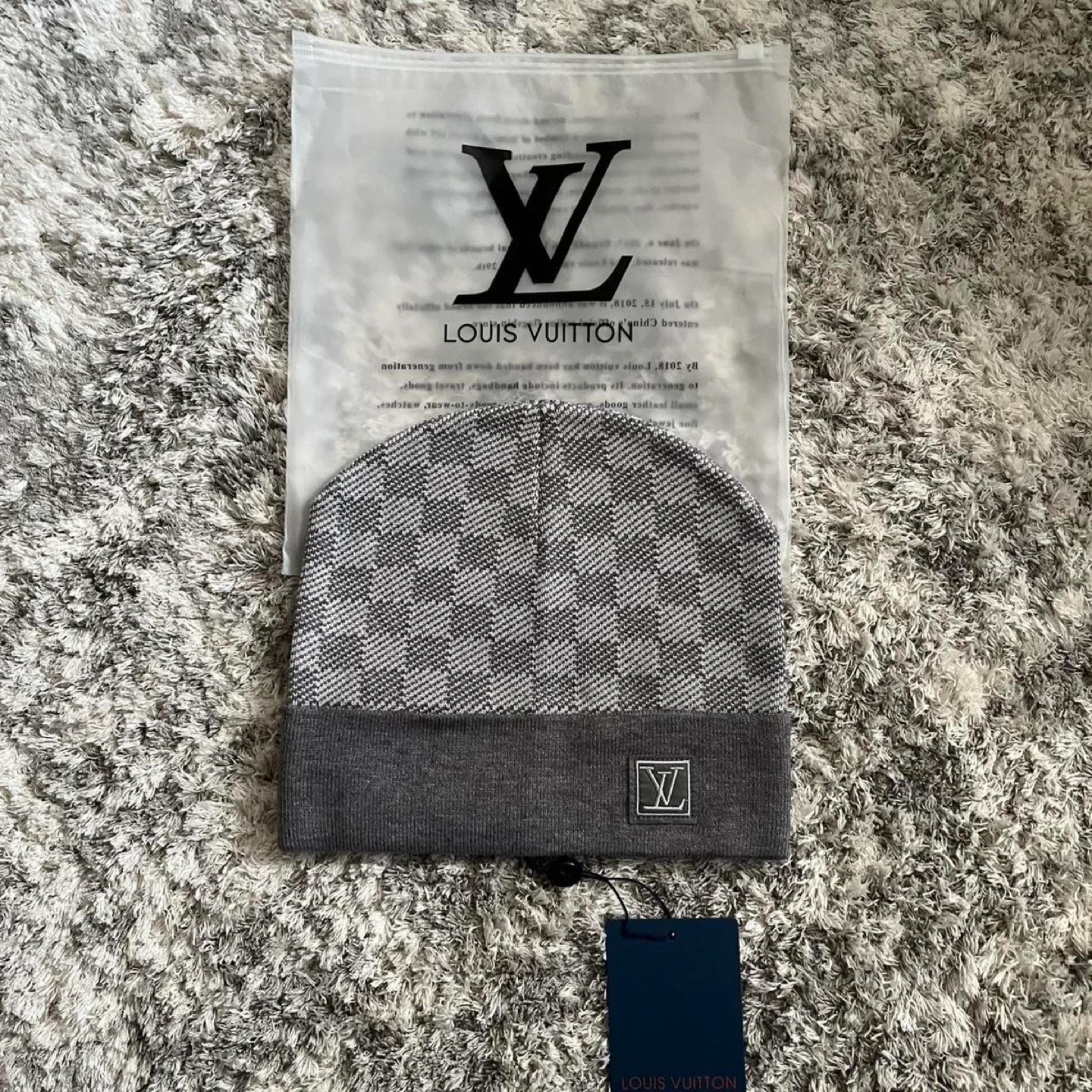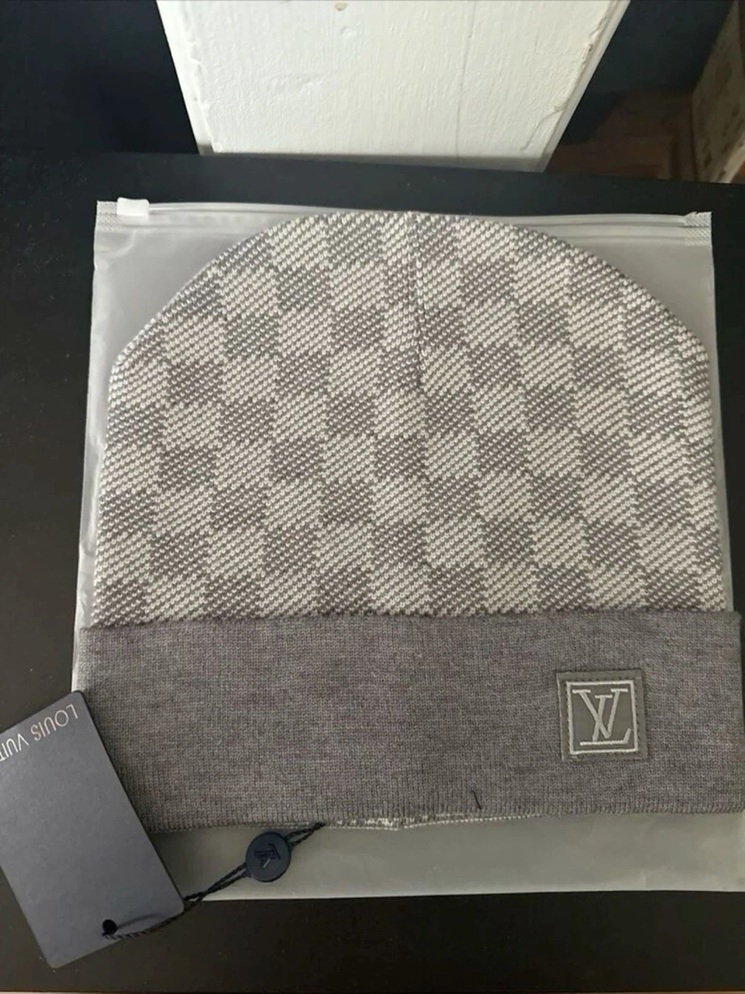 Selling a stylish Louis Vuitton beanie featuring the classic Damier pattern in grey. It's in new condition and comes with the original box and tag!