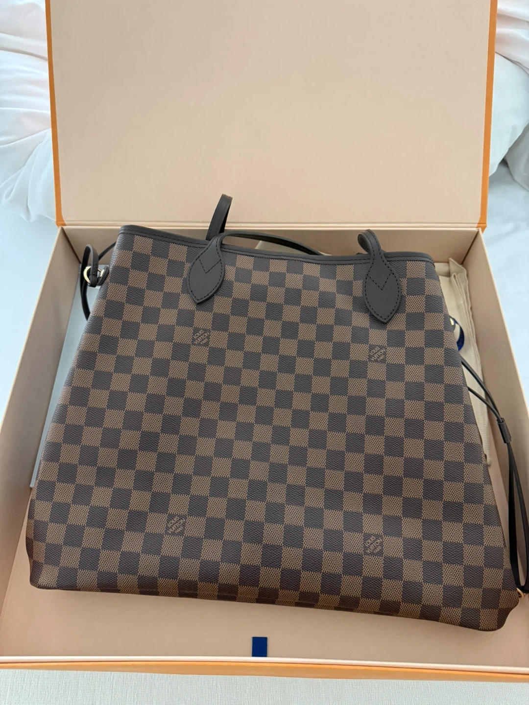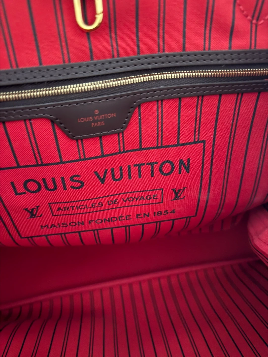 10Selling my Louis Vuitton Damier Ebene Neverfull GM tote bag! It's in excellent condition and comes with the original box, dust bag and receipt. The interior lining is a vibrant red, adding a pop of colour to this classic bag. Perfect for everyday use or as a stylish travel companion