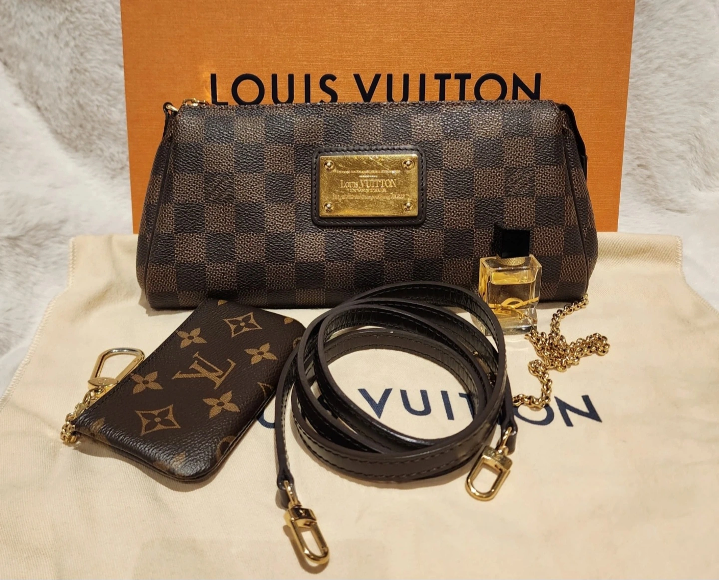 Discontinued Louis Vuitton Eva Cluch in Damier Eben. Comes with strap and dustbag.