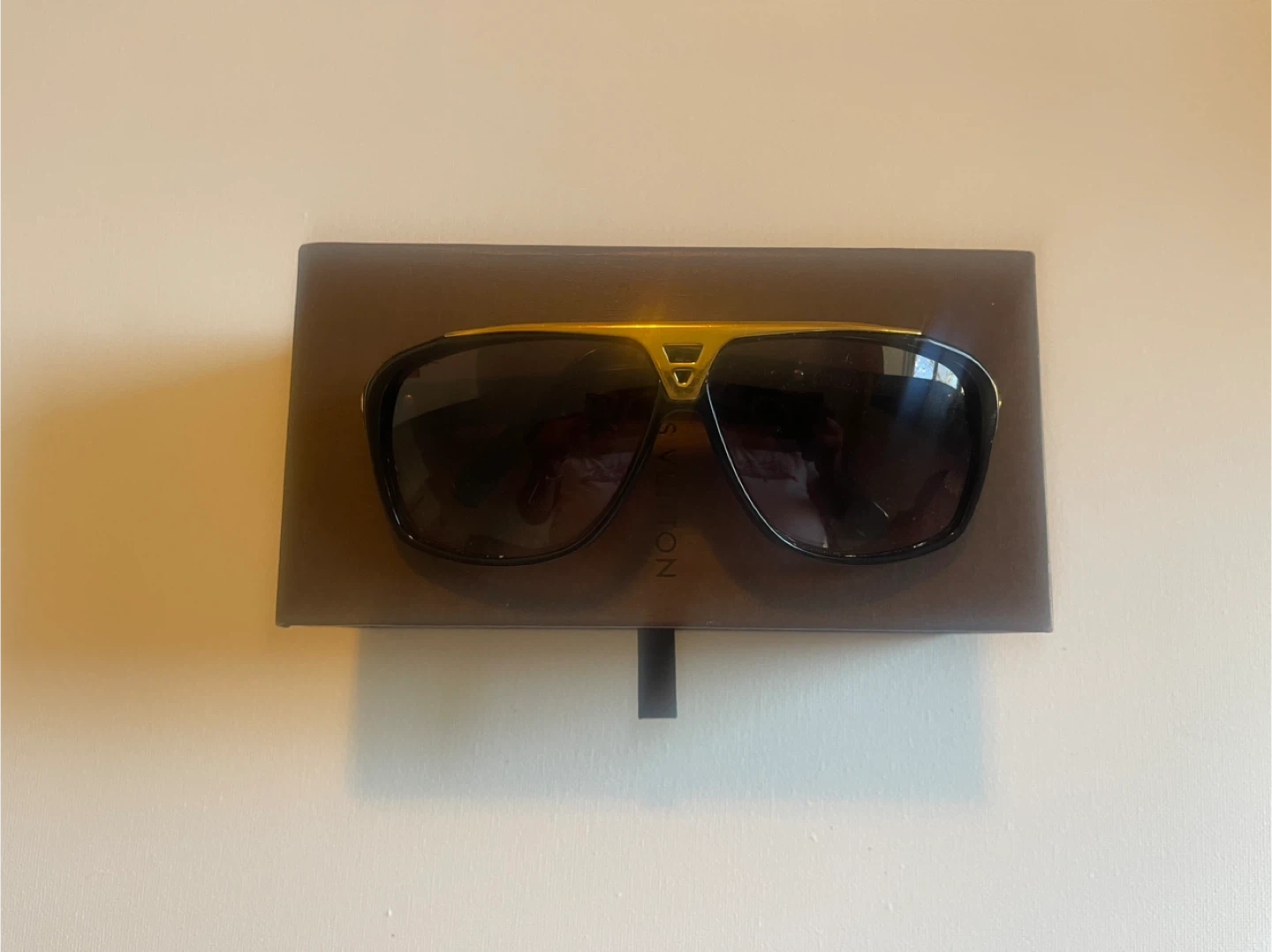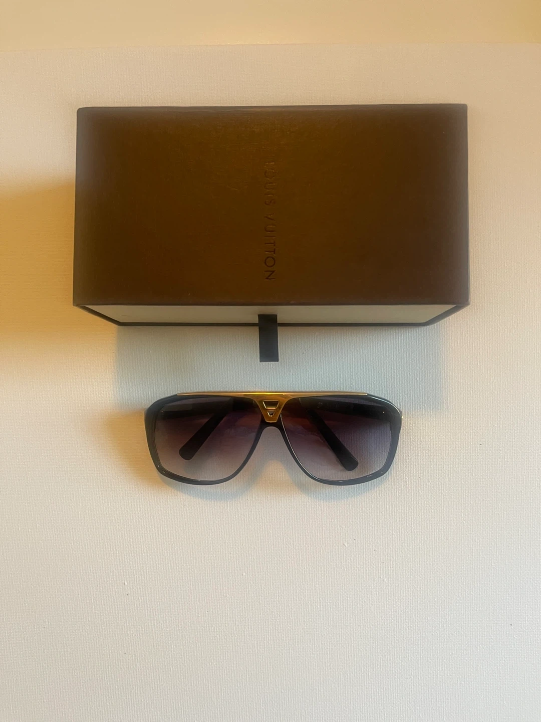 65Selling a pair of Louis Vuitton sunglasses with a black and gold frame. They come with the original box. Stylish and in great condition! Evidence glasses are discontinued, come add it to your collection