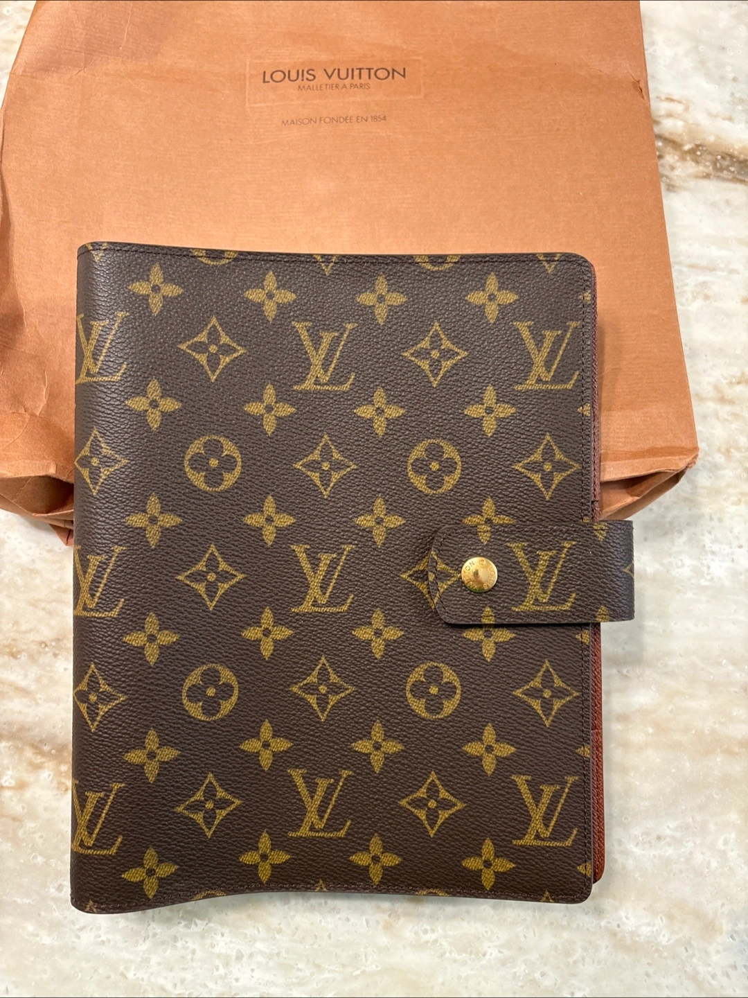 10Brown monogram leather planner. Gold-toned hardware. Multiple pockets and compartments. Includes plastic sleeves. Compact size.