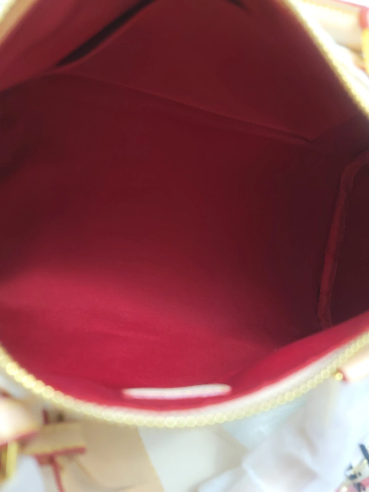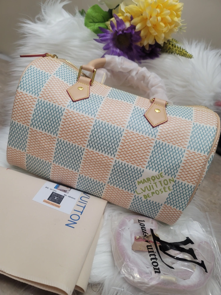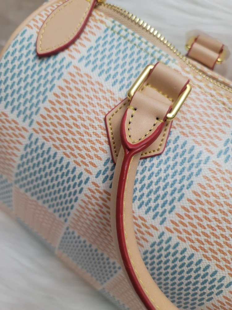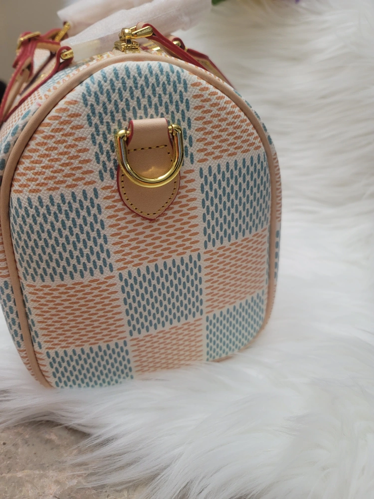 Selling a Louis Vuitton Speedy Bandouliere. It's in great condition and comes with the dust bag and lock. The pattern is a unique checkered design in peach and blue, making it a stylish addition to any outfit