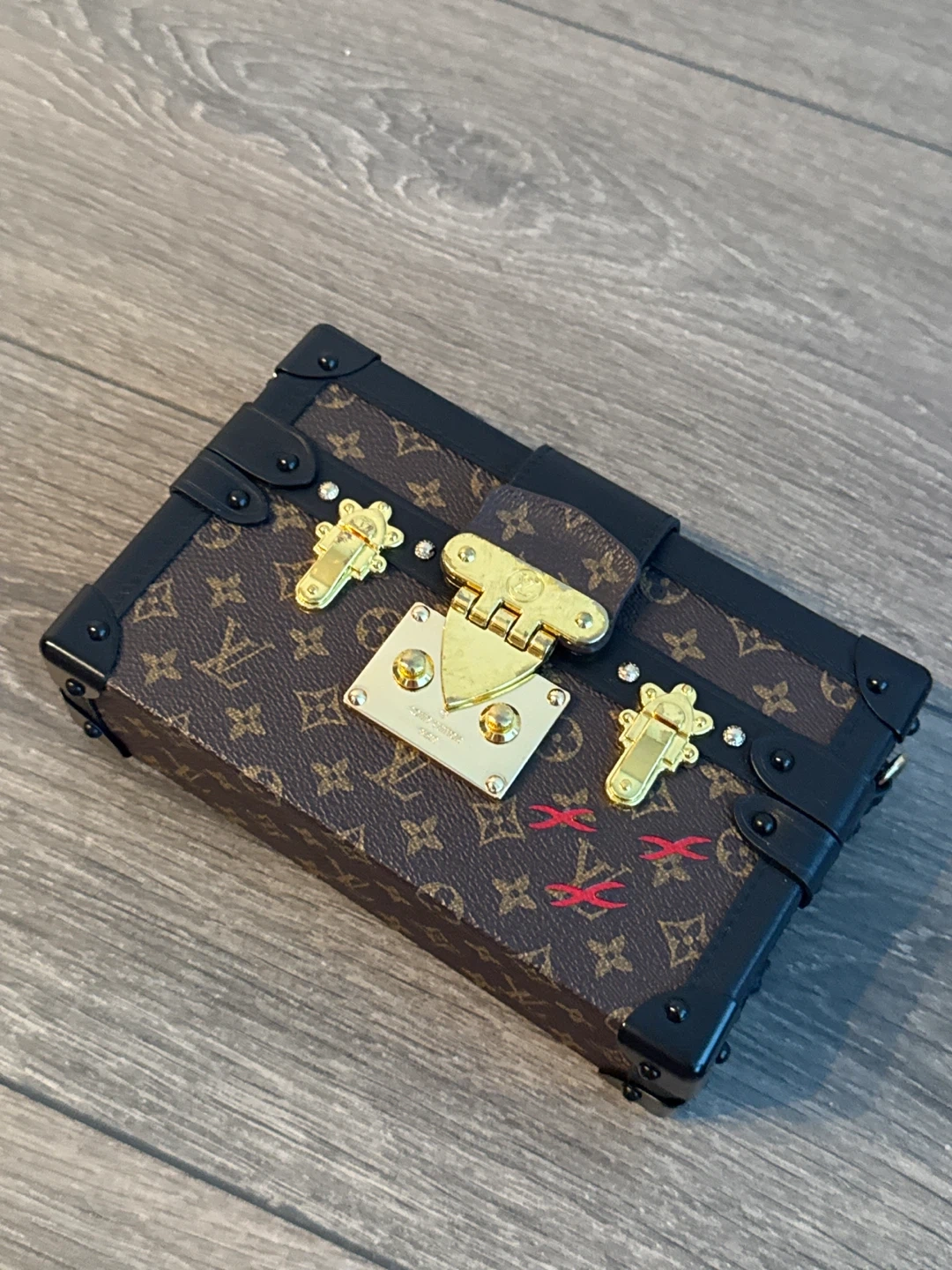 Selling a Louis Vuitton trunk clutch. This is a beautiful piece in great condition! It features the classic LV monogram pattern and black leather trim. Perfect for adding a touch of luxury to any outfit