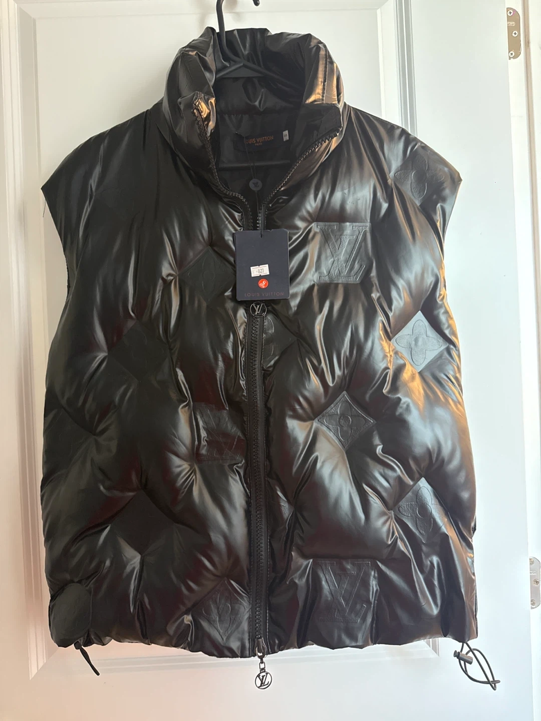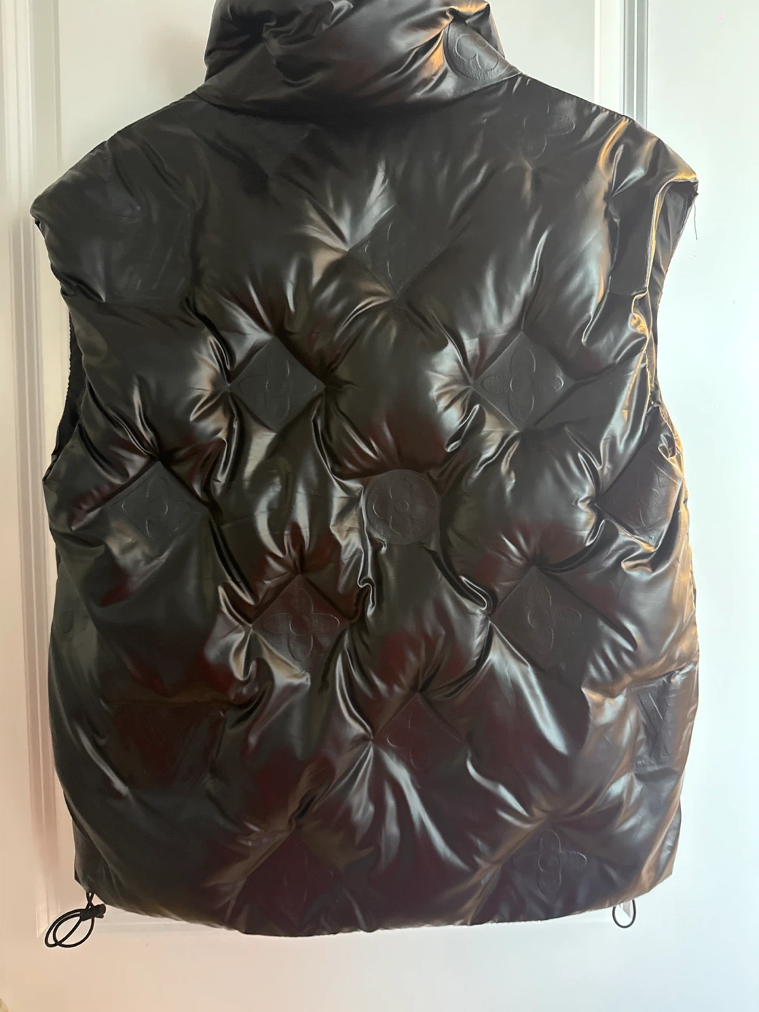 5Selling a stylish Louis Vuitton version black padded vest! It's in great condition and features a unique quilted design with the LV logo subtly incorporated. Perfect for adding a touch of luxury to your everyday look. The vest has a full zipper and drawstring at the bottom.