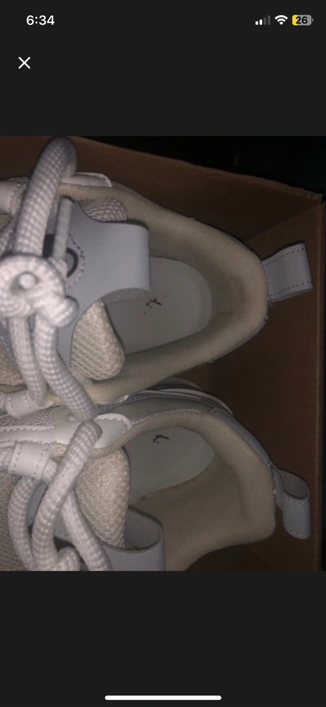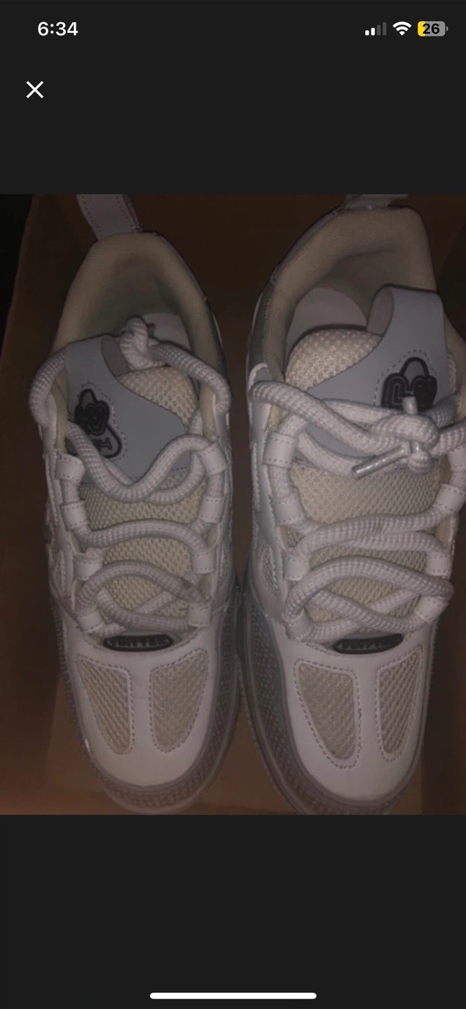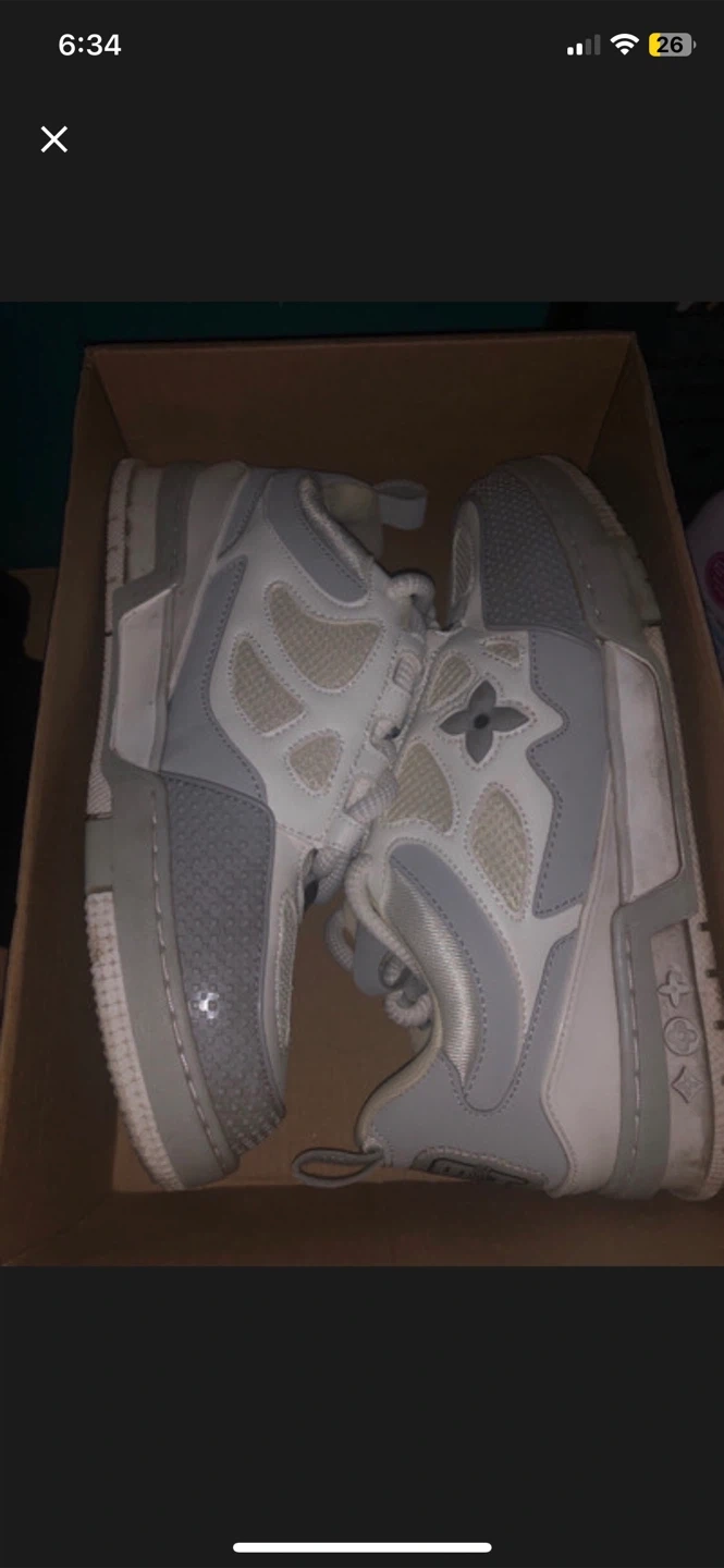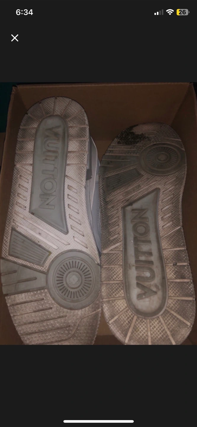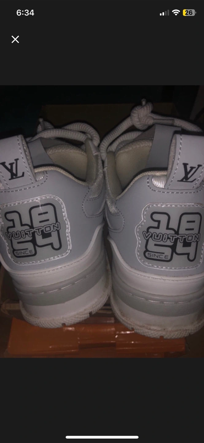 10Selling a pair of Louis Vuitton sneakers in white and grey. They show some signs of wear on the soles, but the upper part is still in good condition. The shoes feature the LV logo and '1854' on the back. Great for adding a touch of luxury to your everyday style!
