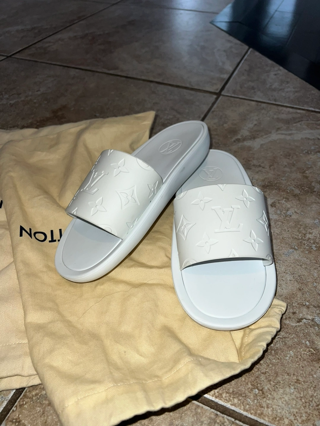 Authentic Louis Vuitton Monogram slides They’re in excellent condition and come with the original dust bag. Used once at resort. Pickup can be arranged locally or in Toronto/GTA