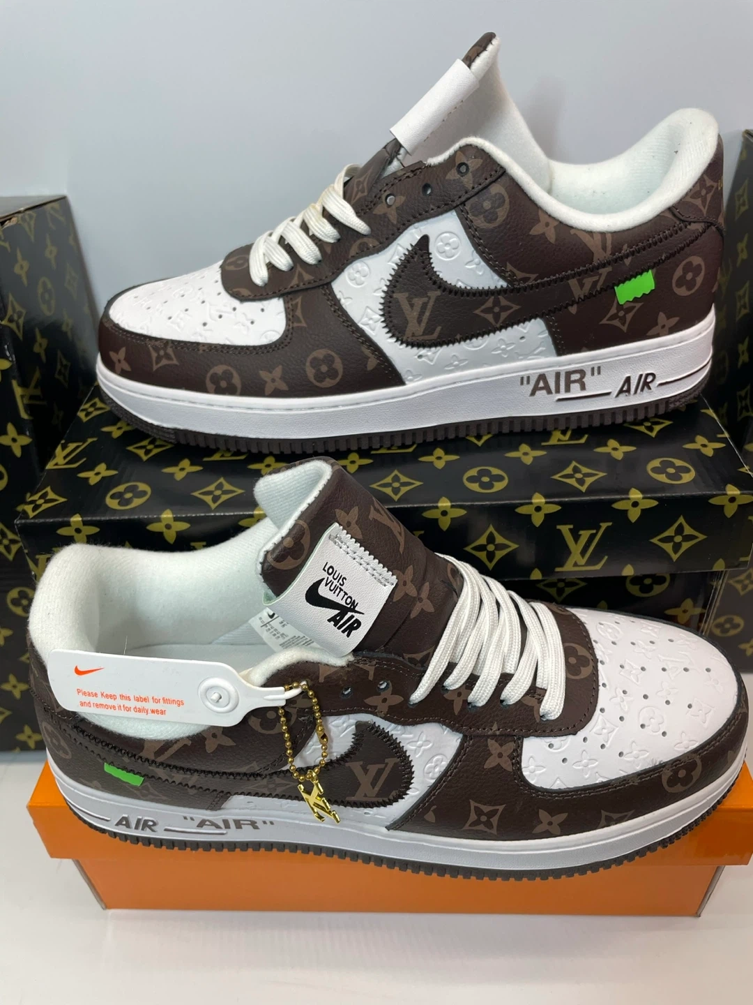 Selling a pair of Louis Vuitton x Nike Air Force 1 sneakers! These shoes feature the iconic Louis Vuitton monogram print in brown and white. They come with the original box