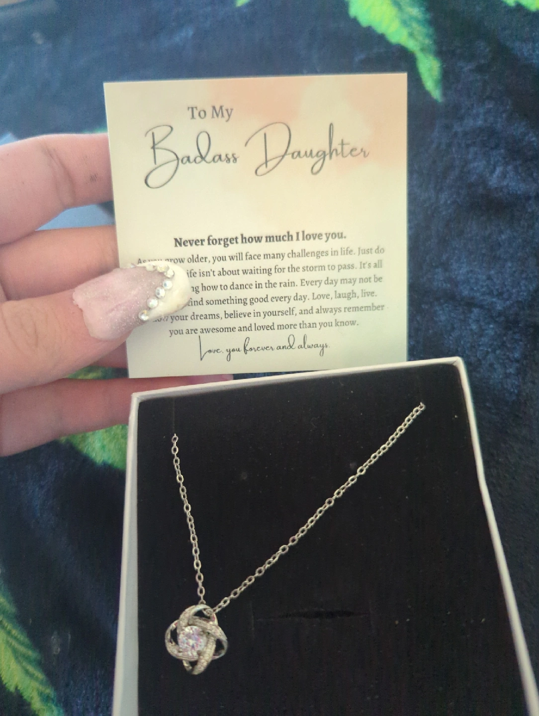 A delicate love knot necklace with a sweet message card. The card reads, "To My Badass Daughter. Never forget how much I love you." It's a beautiful piece for someone special