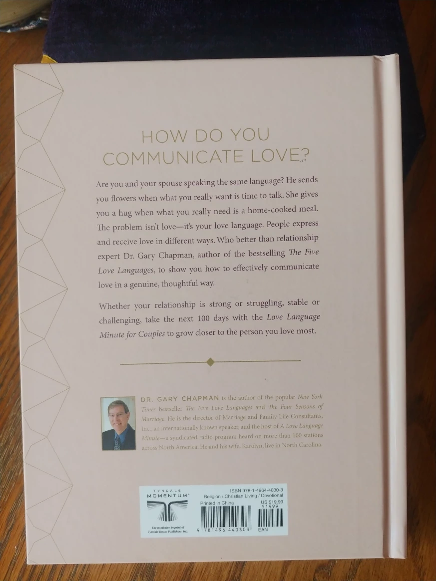 17Selling 'Love Language Minute for Couples' by Gary Chapman! Recieved as a gift new and never used. It offers 100 days to a closer relationship, perfect for couples looking to connect on a deeper level. It explores how to effectively communicate love and strengthen your relationship with thoughtful insights and practical advice