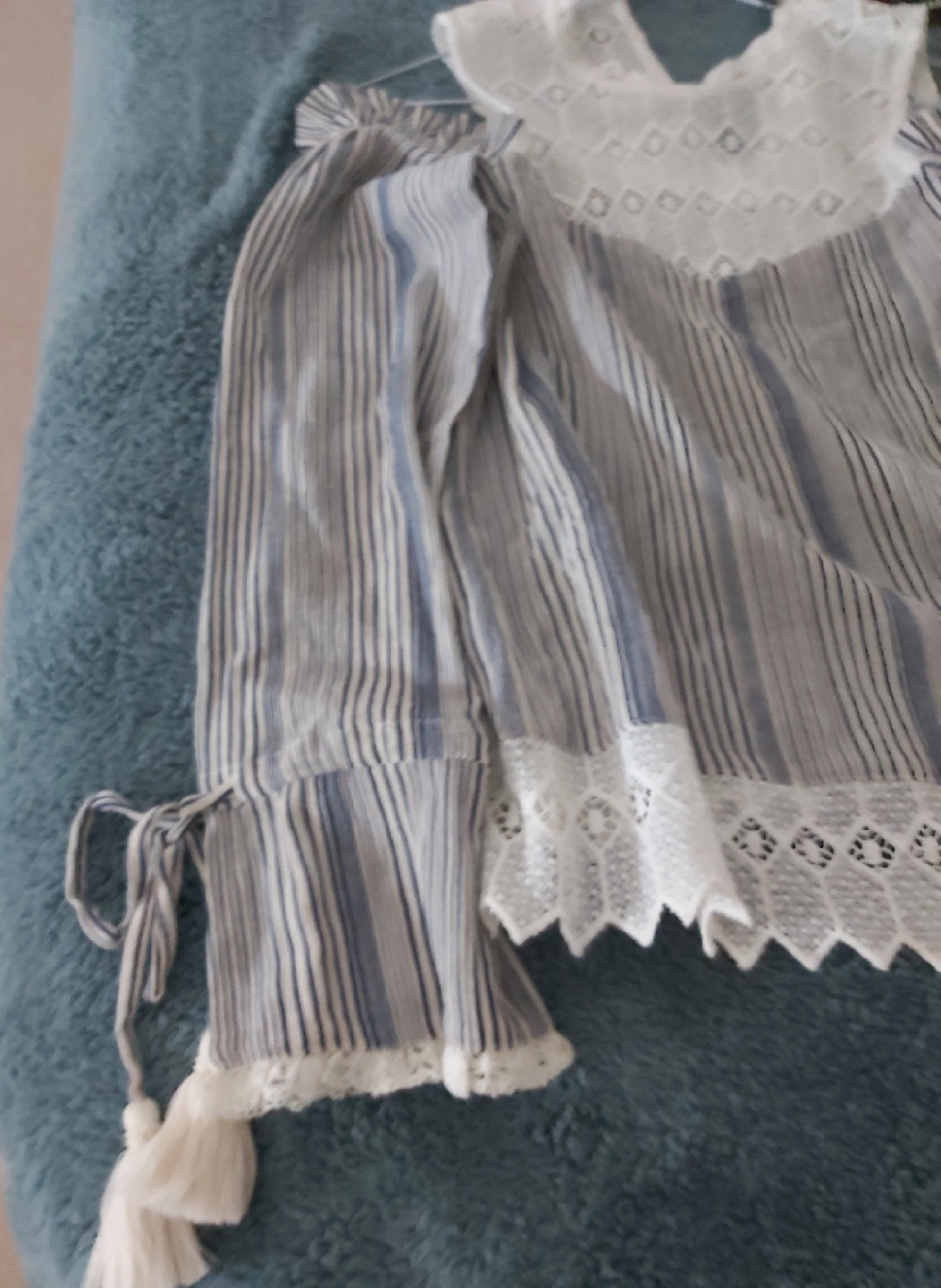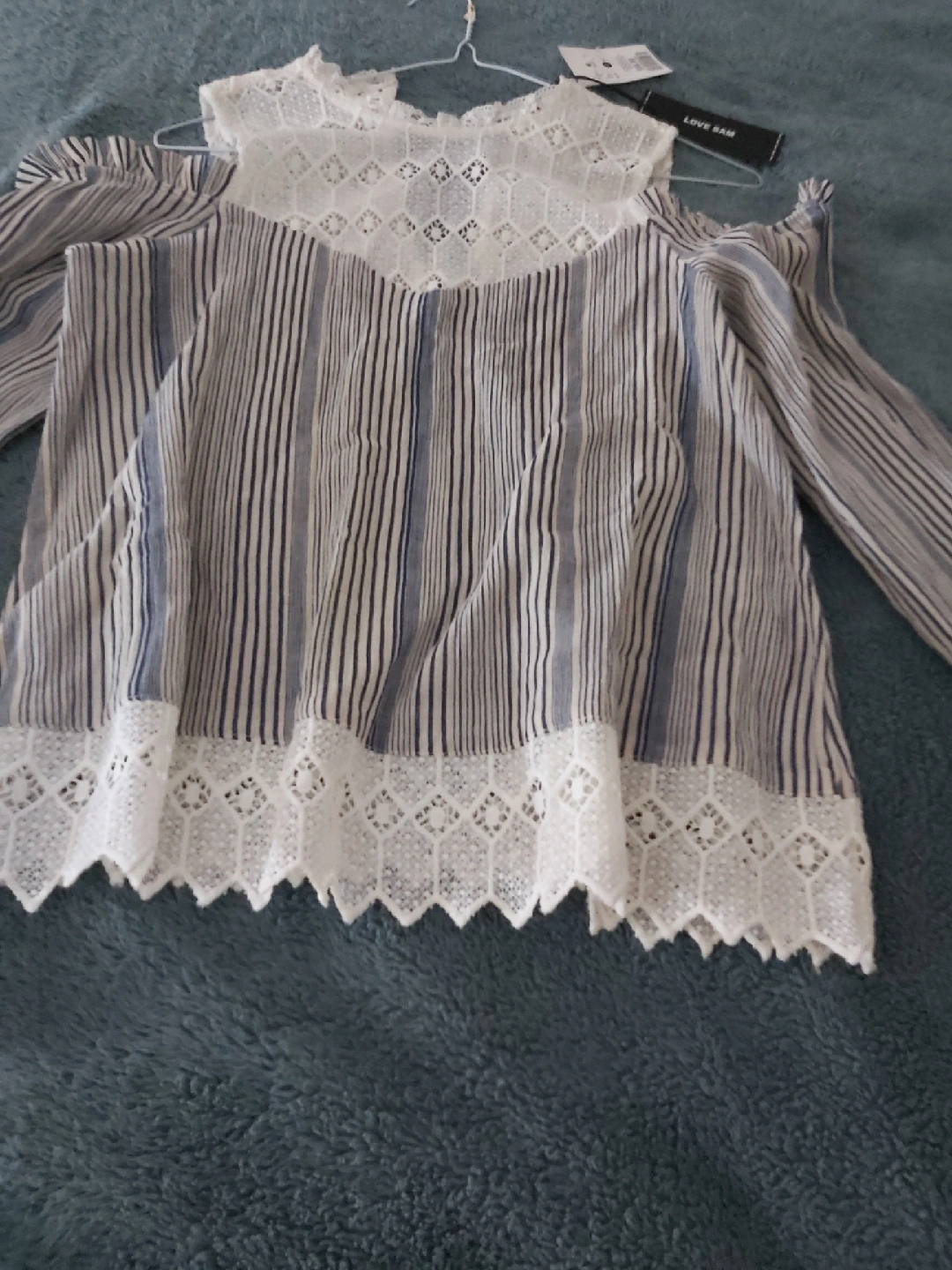 10Here's a cute Love Sam blouse with a striped pattern and lace detailing! It has long sleeves with tie details and a unique cold shoulder design. Perfect for adding a touch of elegance to your outfit