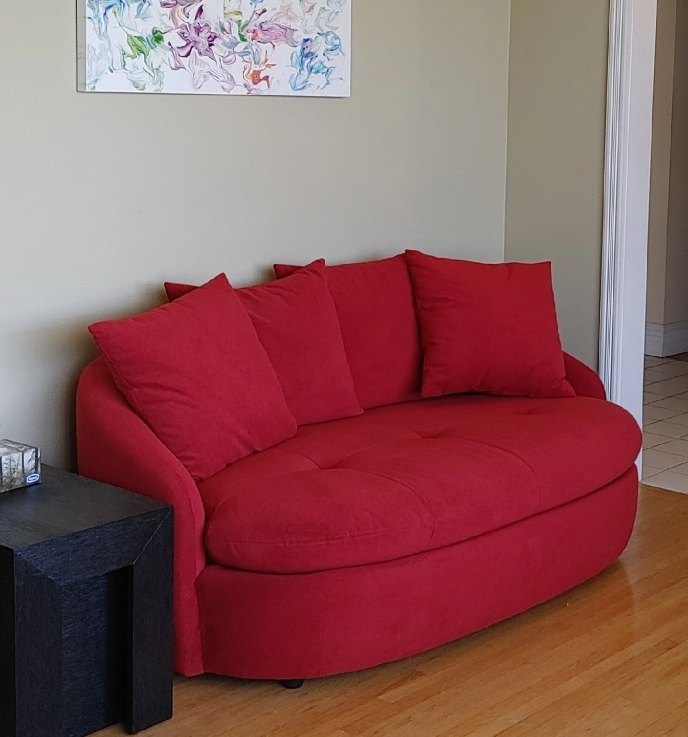 60Cash Only! Only 3yrs old. Hardly used, deep seating. We're renovating and it no longer works in the space. The back of the love seat is about 27" from the floor, roughly 63" long and 32.5"deep (from backrest to edge of the seat). It's in great shape and would be perfect for a small living space or den. Comes with the cushions shown in the picture. Bring help to pick it up as I'm not able to assist. If the add is up, it's still available!