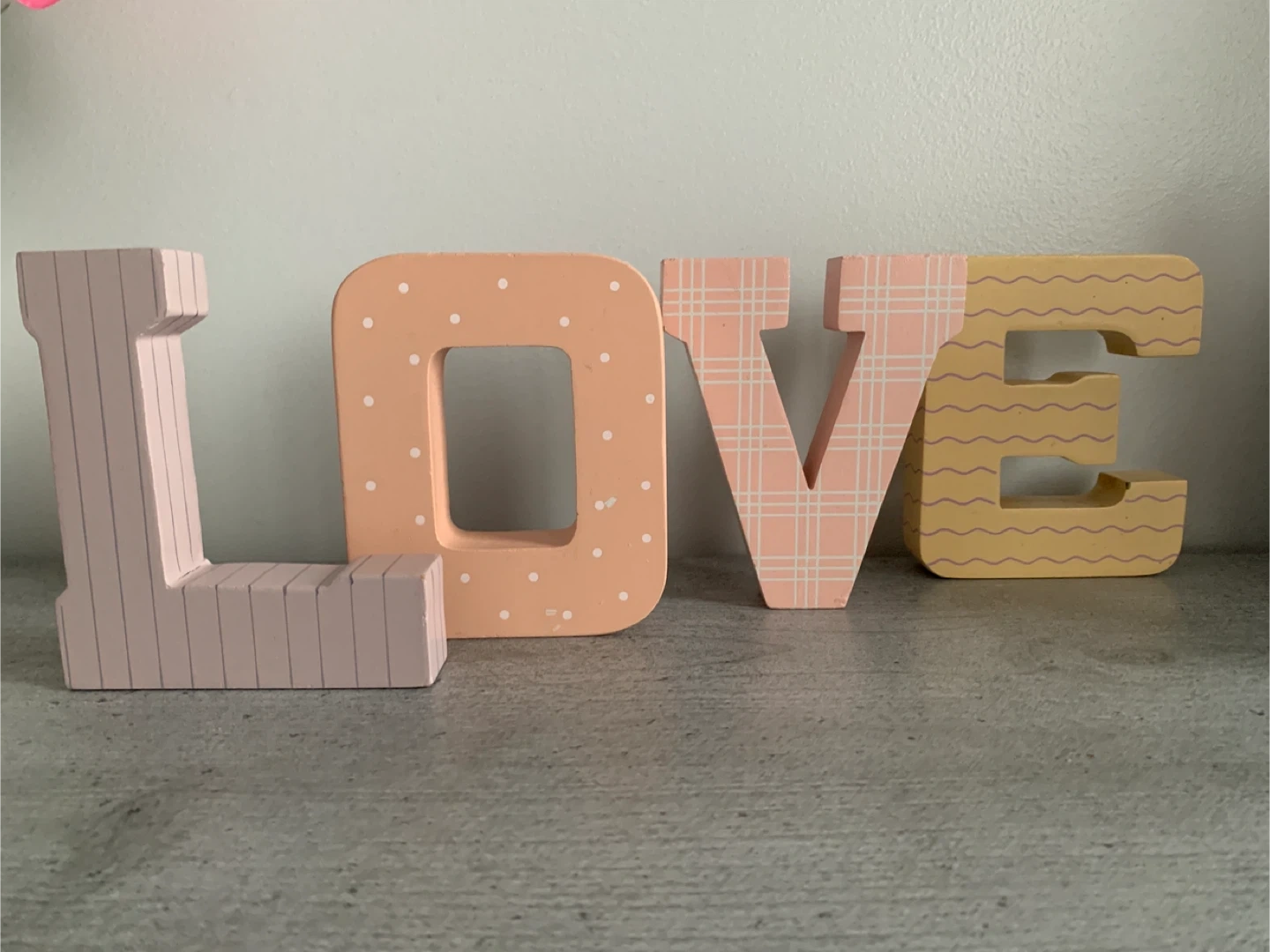 25Cute 'LOVE' wooden letter decorations for your home! The letters are in soft pastel shades of light purple, peach, pink, and yellow. They can stand upright on their own or be hung on the wall. Perfect for adding a touch of charm and warmth to any room.