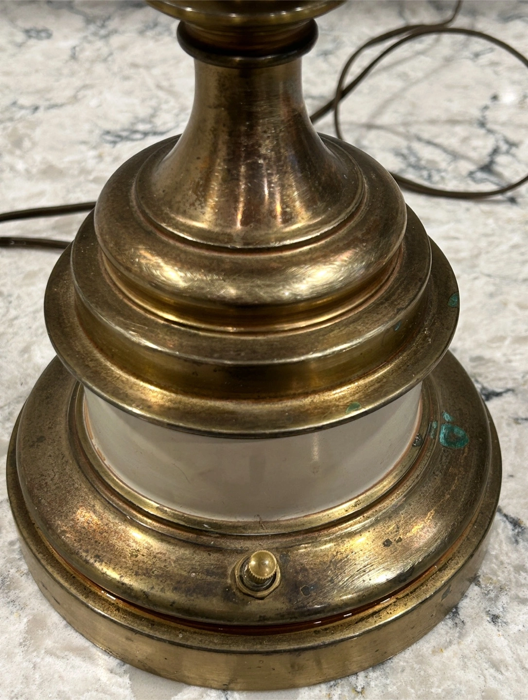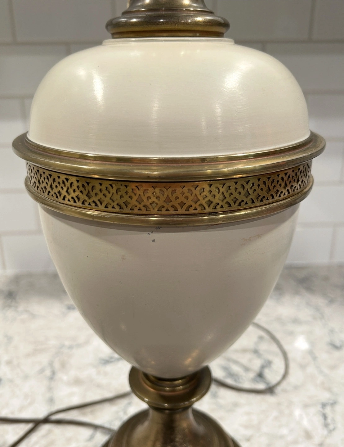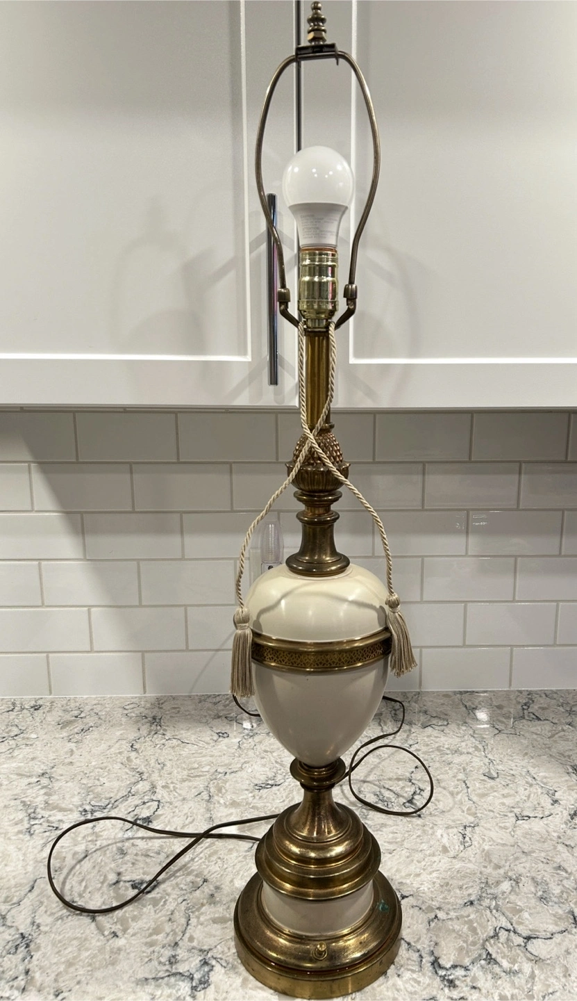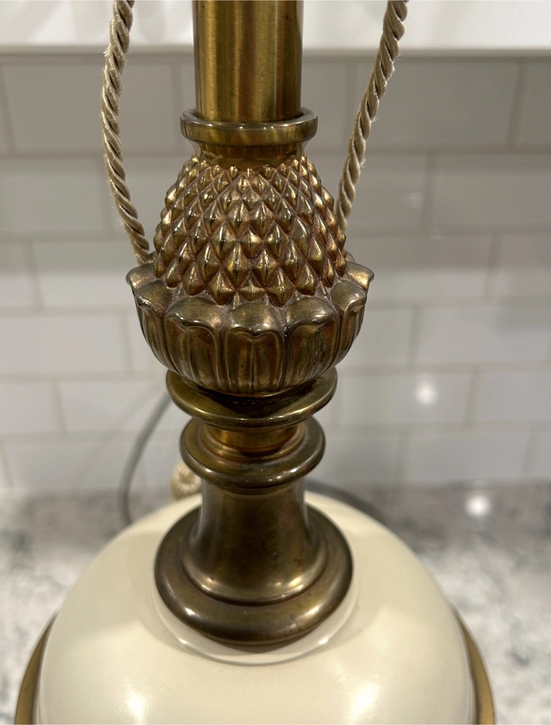 Lovely Vintage/Antique Style Brass Table Lamp Excellent condition other then the brass is starting to tarnish on the base (can see in pics) Features a cream colored body with brass accents and detailing Approx 33 in tall from base to top of shade holder No shade just lamp Would add a touch of elegance to any room! See other listings for more lamps, lights and candle holders