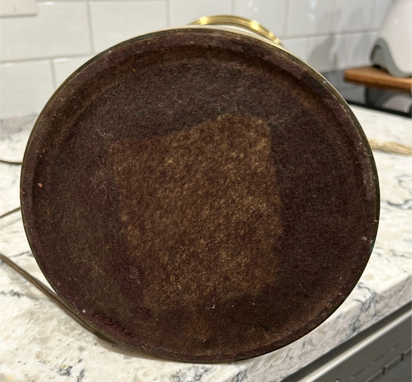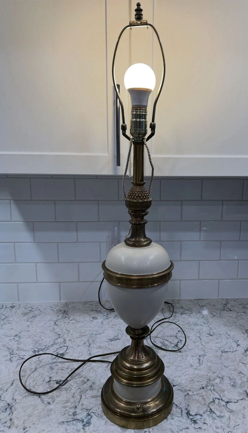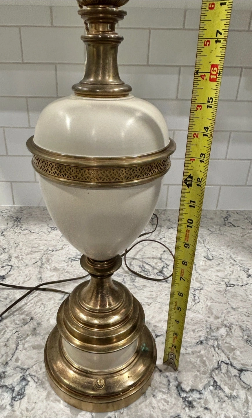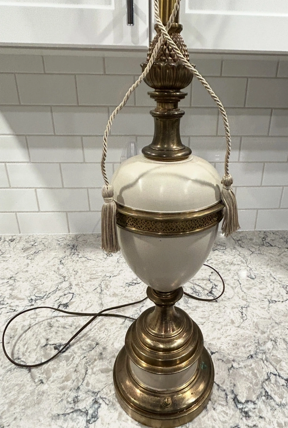 Lovely Vintage/Antique Style Brass Table Lamp Excellent condition other then the brass is starting to tarnish on the base (can see in pics) Features a cream colored body with brass accents and detailing Approx 33 in tall from base to top of shade holder No shade just lamp Would add a touch of elegance to any room! See other listings for more lamps, lights and candle holders