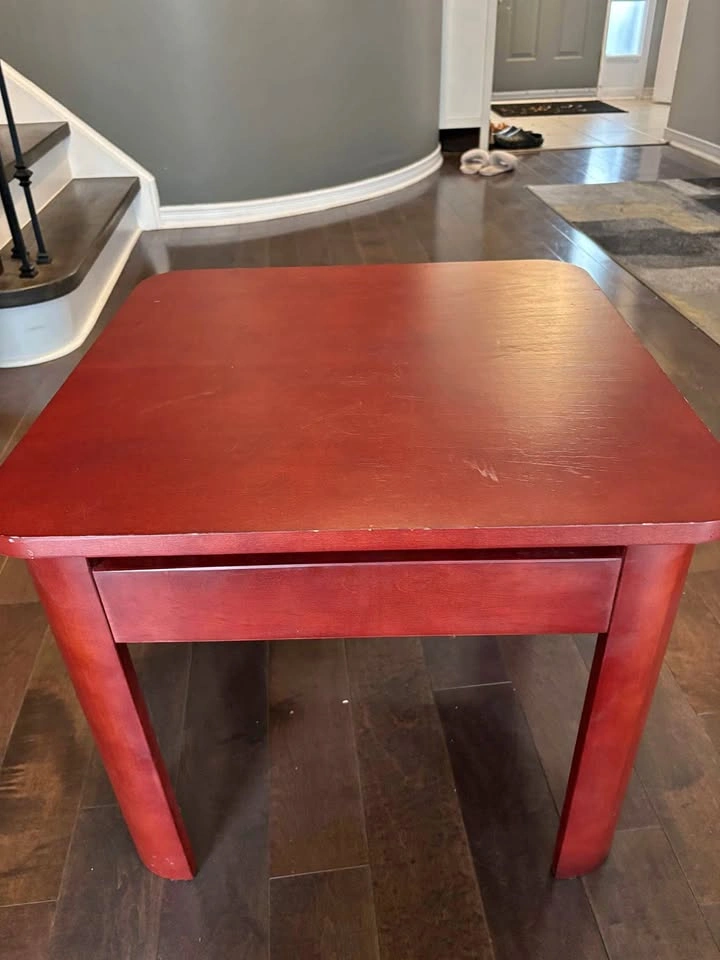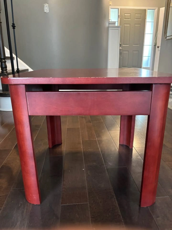 Sturdy wooden low coffee table in a rich reddish-brown (mahogany/cherry) finish. Perfect for a living room, playroom, or as an accent piece. Some light surface scratches from use, but still solid and functional. Asking 40$ OBO