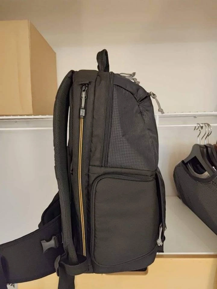 The lowepro fastpack bp 250 aw ii: A quality dslr water resistant backpack that can fit a DSLR with 2-3 lenses. Modular camera gear storage, big laptop & tablet pocket, tripod pouch, and room for some extras in the top compartment. Rarely used, got as a gift, and has everything included that I got (except documentation). Scuffs on top pocket pic are from pencils, probably easy to clean.