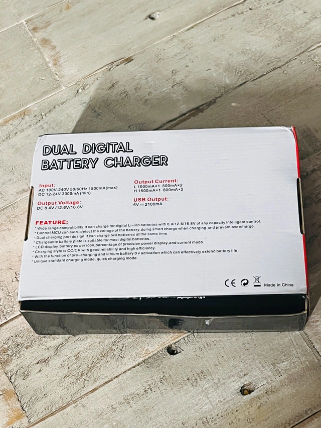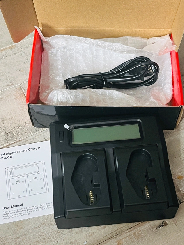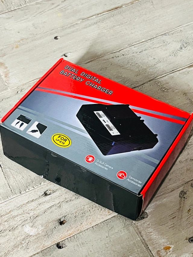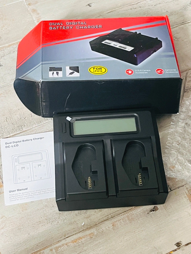 86This new dual digital battery charger is compatible with Canon LP-E19 batteries, perfect for DSLR cameras and camcorders, featuring simultaneous dual charging, a wide voltage range (AC 100V-240V 50/60Hz), and intelligent overcharge protection for optimal battery life. Key Features: * Wide range compatibility for digital Li-ion batteries. * Intelligent control to prevent overcharging. * Dual charging ports for charging two batteries simultaneously. * LCD displays battery power percentage and current mode. * USB Output: DC 5V=2100mA Charges one or two batteries simultaneously; Smart LCD screen displays each battery's charging status; Quick charge with automatic constant current control prevents battery from overcharging, short circuit, and electronic shock; This charger, with its advanced features and versatility, is ready to keep your cameras powered up for all your photography needs. If the ad is up, the charger is ready for a new home! Available for pick up in Brampton near Sheridan College at Blue Bonnet Drive.