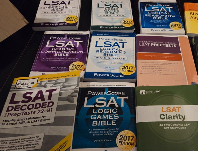 A collection of LSAT prep books for sale, including PowerScore Bibles (Logical Reasoning, Reading Comprehension, Logic Games, all 2017 Edition), workbooks, LSAT Decoded (Princeton Review), PrepTests 72-81, Deconstructed Series, and LSAT Clarity. Pick up only from Yonge & College, downtown Toronto. Price is for all the books. For Sale By: Owner