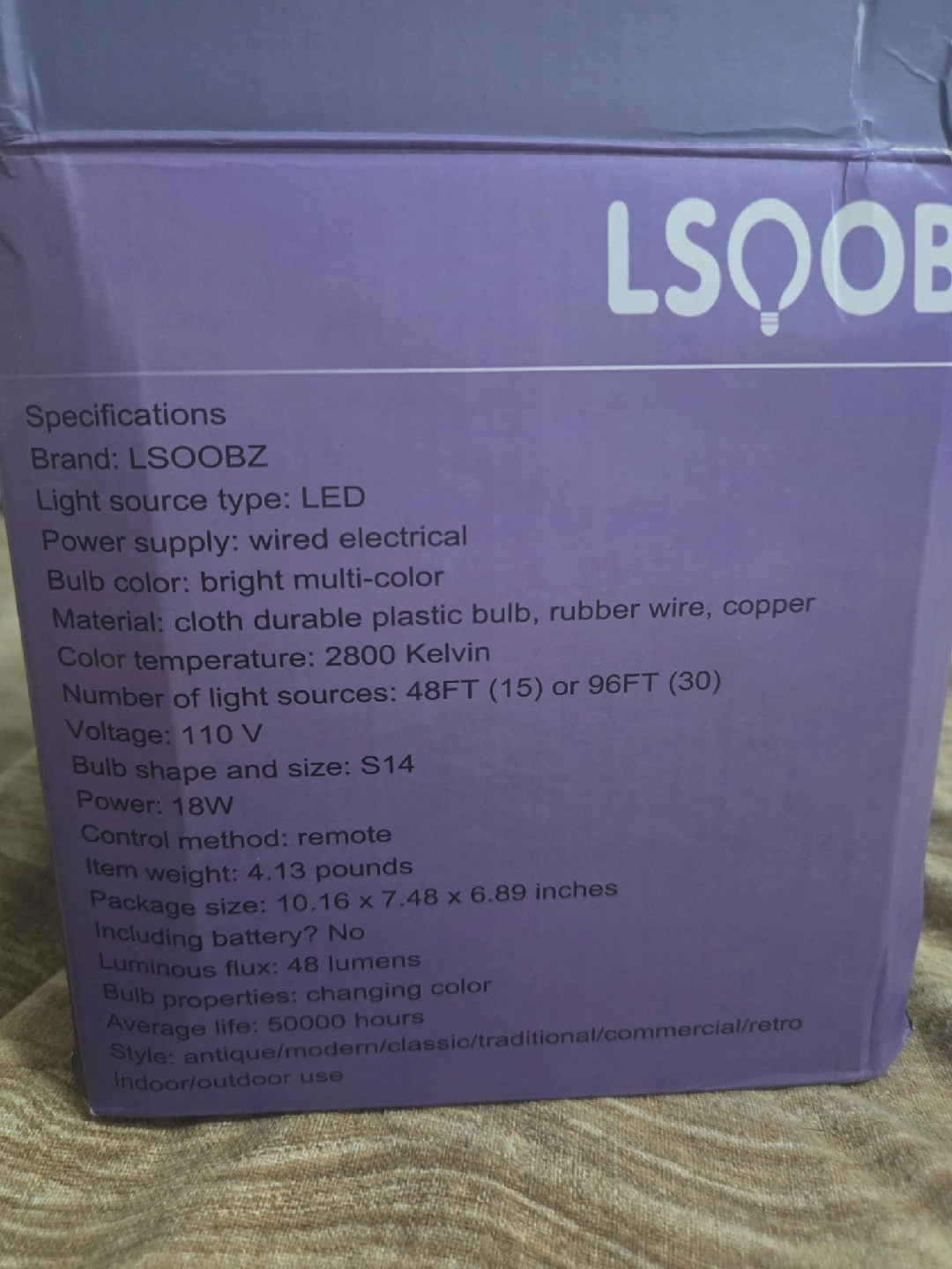Selling a set of LSOOBZ RGB colored string lights! These are 48FT LED string lights perfect for adding a touch of magic to your patio, backyard, or any celebration. They feature 15+1 E26 shatterproof Edison bulbs and have a dimmable commercial cafe string design. The box includes specifications such as: - Brand: LSOOBZ - Light source type: LED - Bulb color: bright multi-color - Material: cloth durable plastic bulb, rubber wire, copper - Indoor/outdoor use