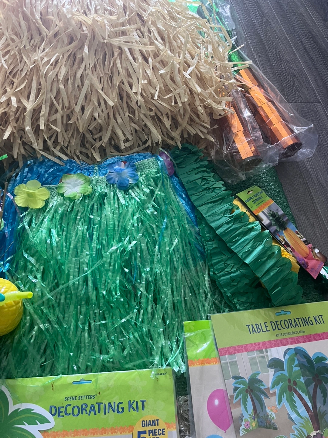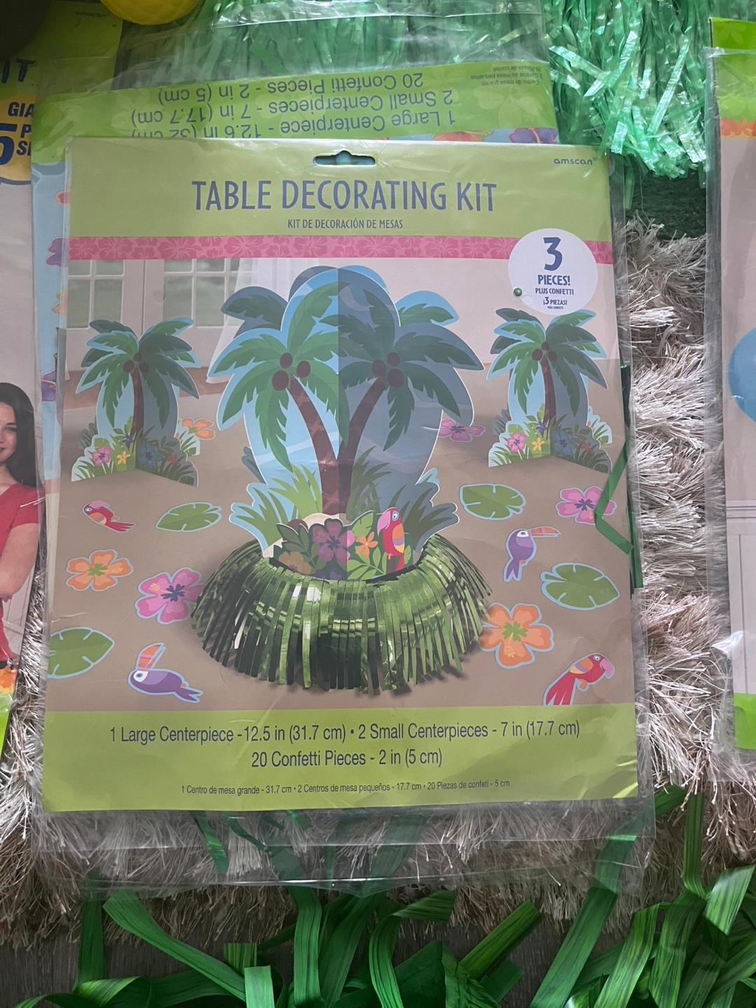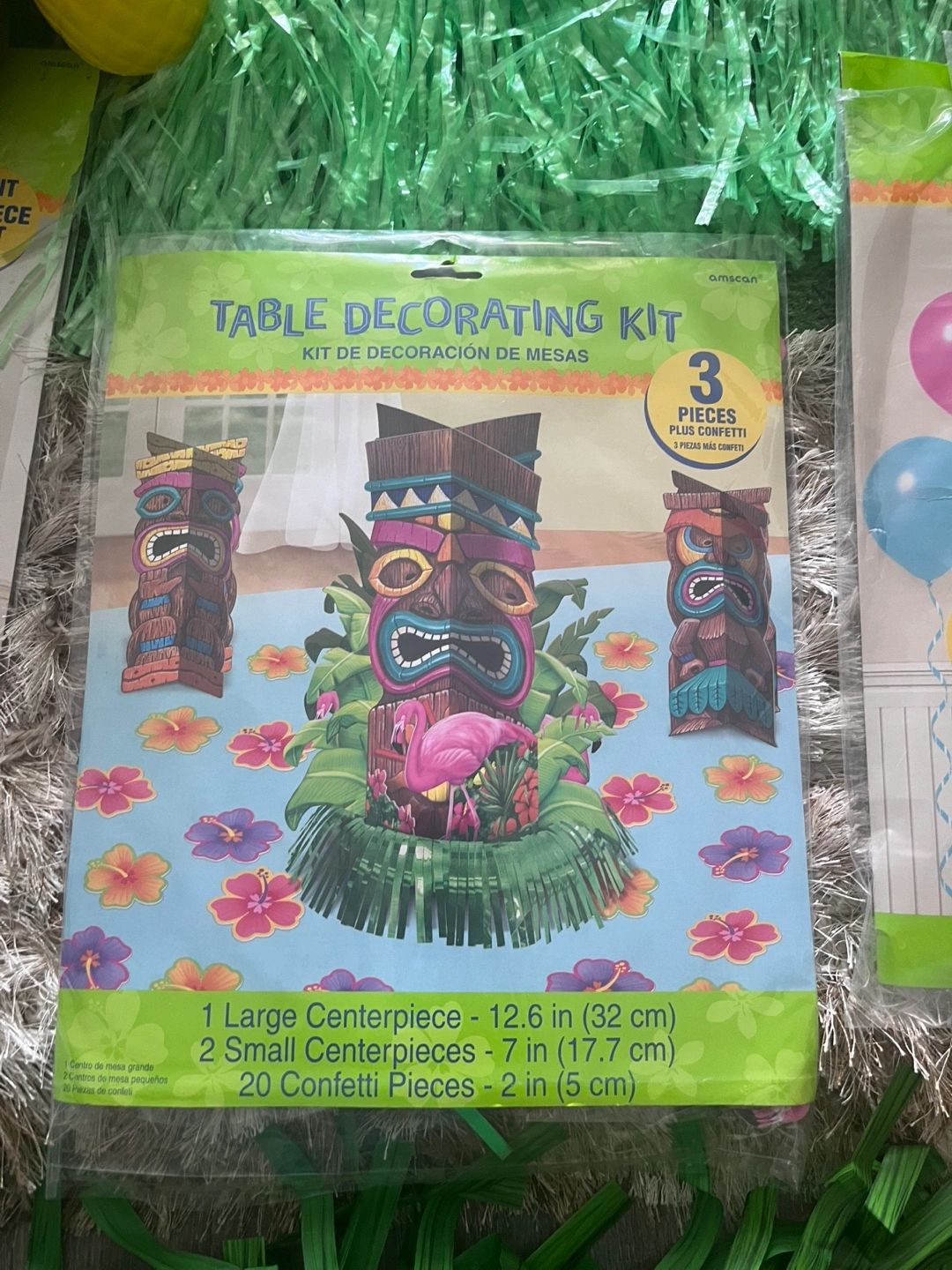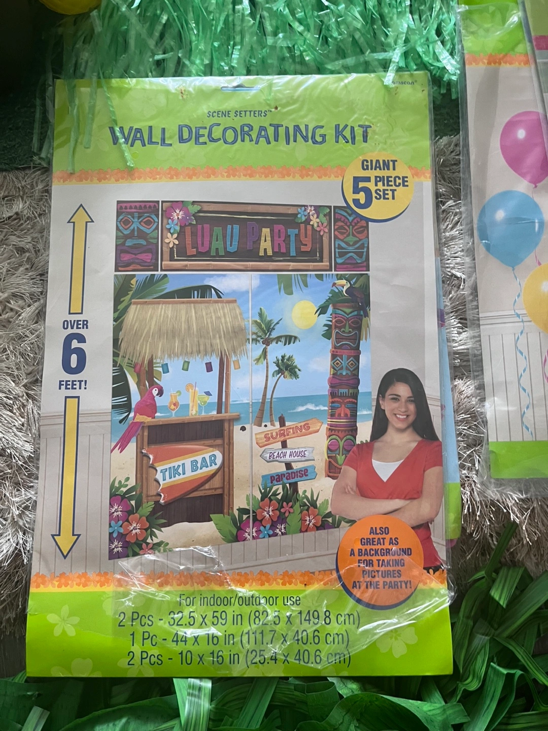 Get ready to hula! This Luau Party Wall Decorating Kit from amscan is a giant 5-piece set that will transform any space into a tropical paradise. Perfect for indoor or outdoor use, it includes pieces measuring 52.5 x 59 inches (82.5 x 149.8 cm), 44 x 16 inches (111.7 x 40.6 cm), and 10 x 16 inches (25.4 x 40.6 cm). Also included are table decorating kits with centerpieces and confetti to complete the look! Tiki party set pickup Kelvin Grove. Over 75 piece all ready for your tiki backyard party. 6ft cut out 2 table skirts 1 - Lawn sign 15 - Lays 1 - Privacy grass 2 - Fake grass 5 - Coconut tree 1 - straw hat 4 - Drink cups with lids and straws 2 - 20” Tall trees 4 - Straw skirts 2 - Pineapple center piece 3 - plastic signs 5 Piece wall decorating kit 23 Piece table decoration kit 1 - Large center piece 1 - Door curtain 2 - Large wall grass