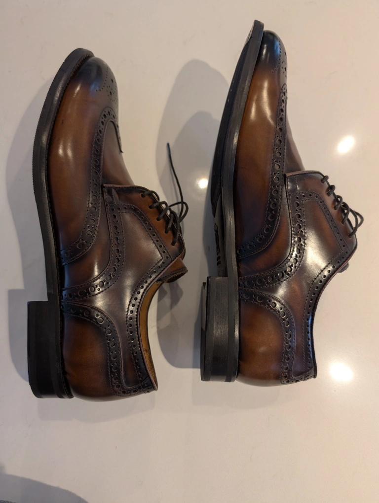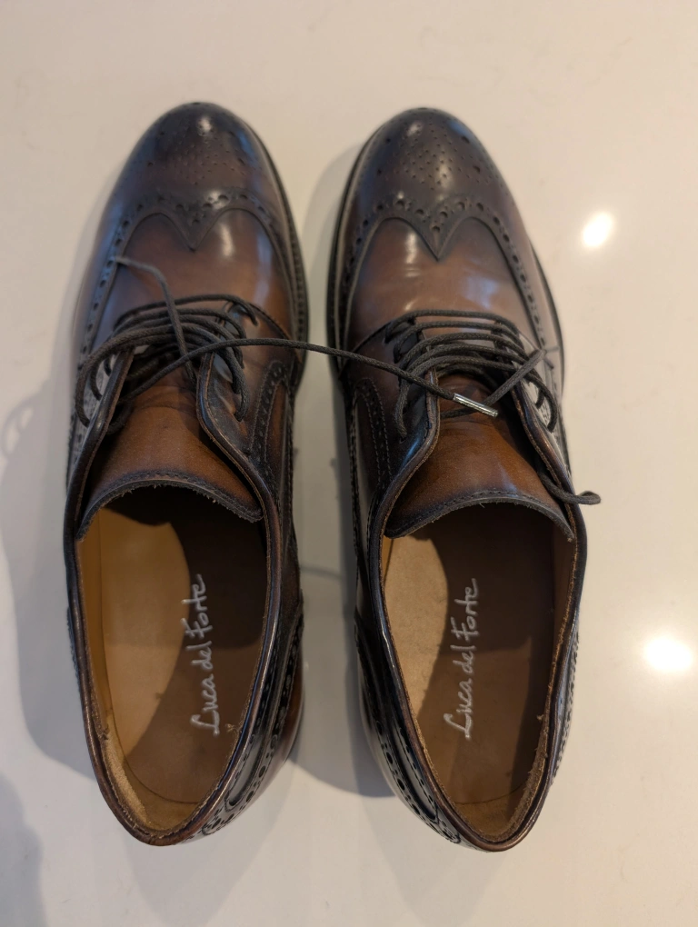 10Selling a pair of Luca del Forte dress shoes in a beautiful brown leather. These wingtip shoes have a classic and stylish design. They are in great condition and would be a fantastic addition to your wardrobe!