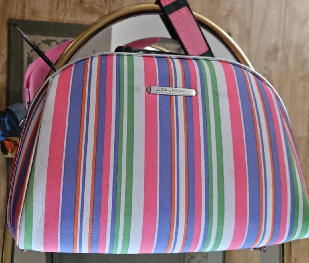 73Here's a cute Luca Vergani cosmetic bag! It features a colourful striped pattern in pink, purple, green, and white. Perfect for travel or organizing your makeup at home
