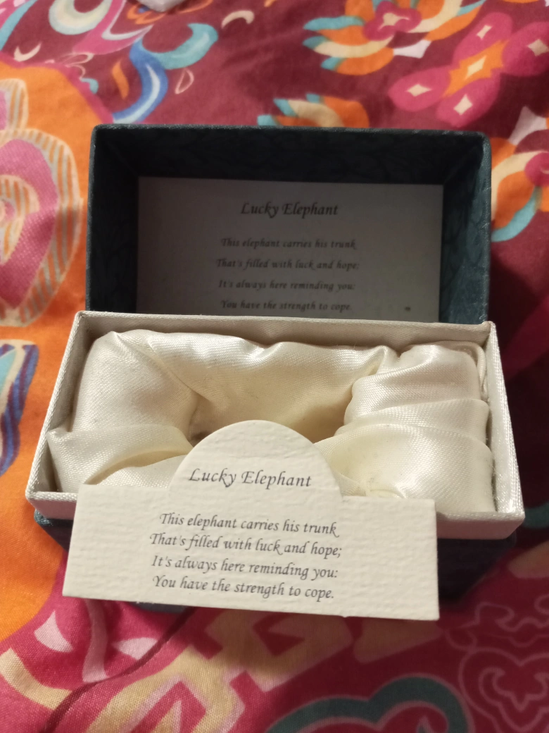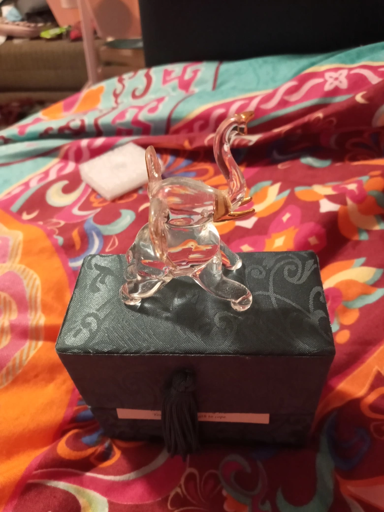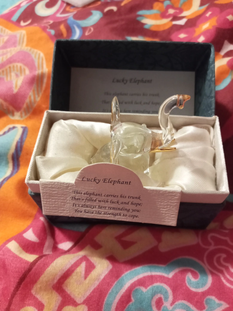 30This is a beautiful little glass elephant figurine that comes in its original box! It's a "Lucky Elephant" and the little card inside says: This elephant carries his trunk. That's filled with luck and hope; It's always here reminding you: You have the strength to cope. It would make a lovely gift!
