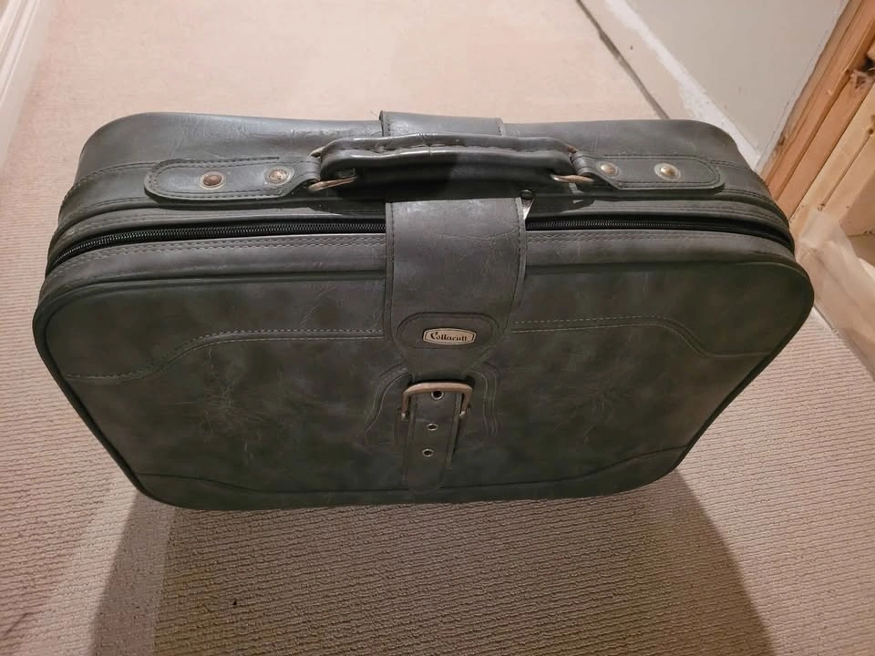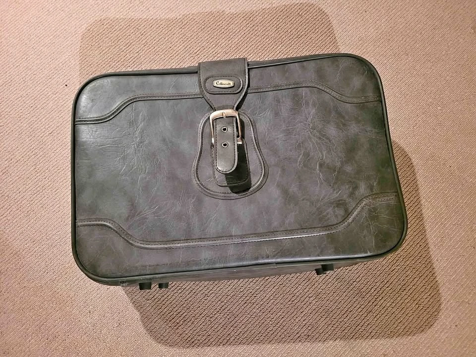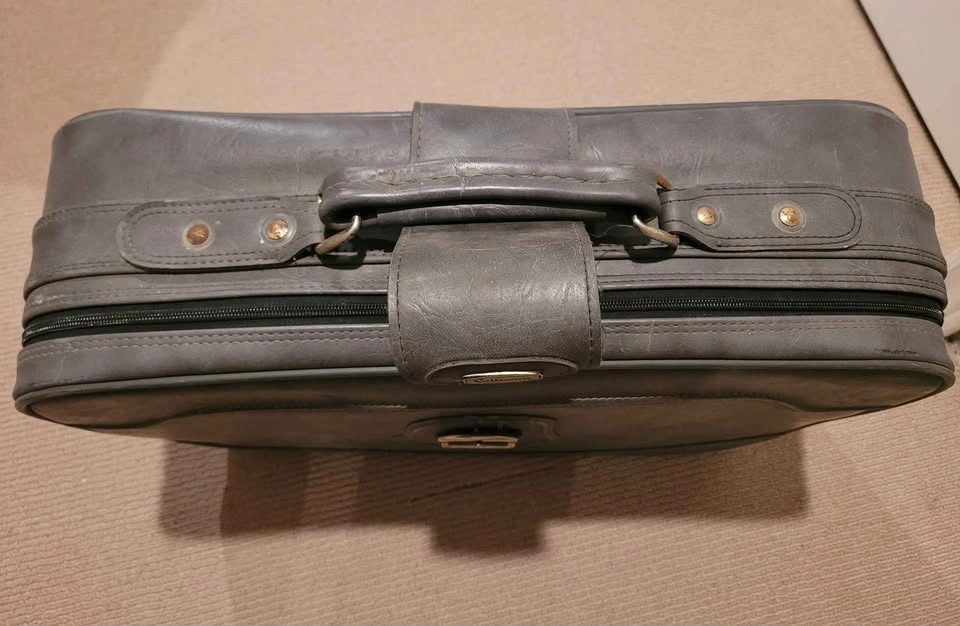 10Gray vintage carry on luggage. Zippers, clips everything in working condition, clean. Solid piece of luggage. 21 wide 15 high, 6 deep. Asking $10