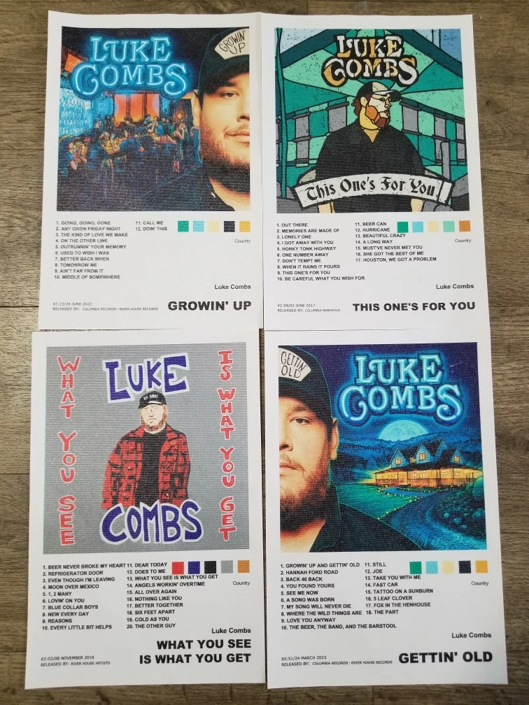 240Selling a set of Luke Combs album cover prints! These include the album covers for: - Growin' Up - This One's For You - What You See Is What You Get - Gettin' Old Perfect for any country music fan! Brand new 8x12