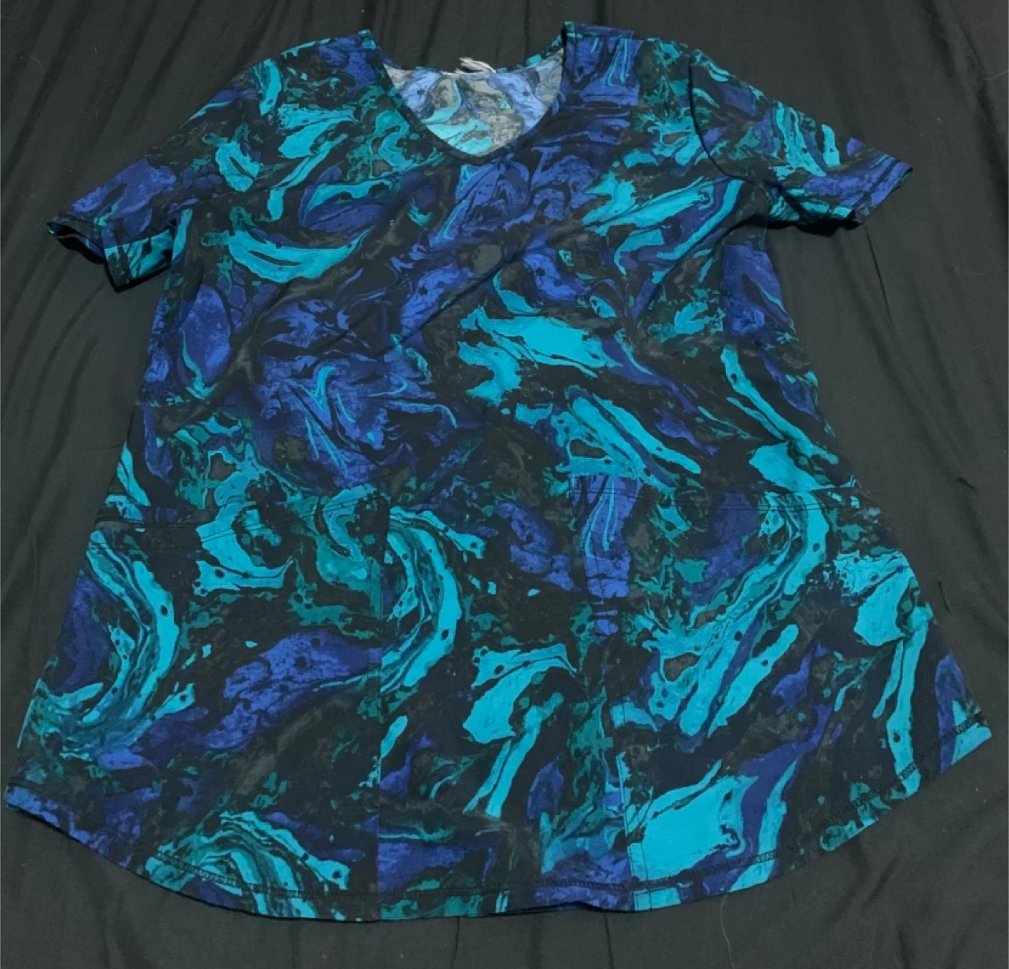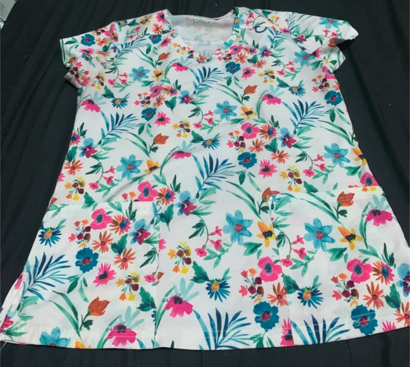 I'm selling two scrub tops in size small. One top has a blue and black marble-like pattern, and the other has a floral pattern on a white background. Both are in great condition and ready for a new home!